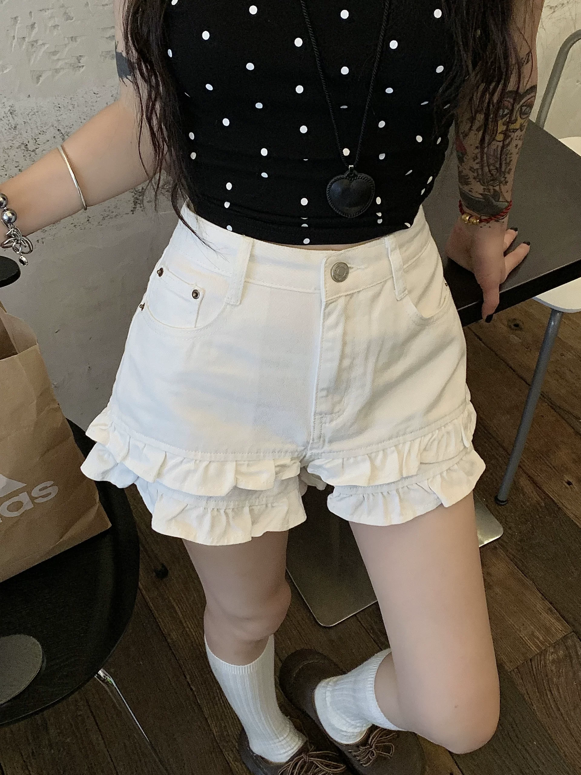 Ruffled straight fit hip-hugging high-waisted A-line denim shorts