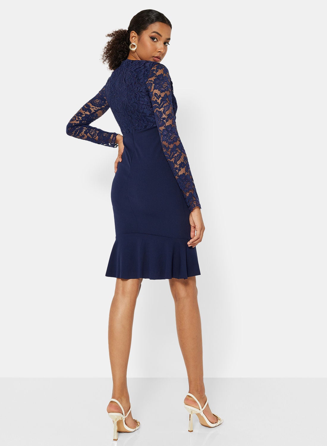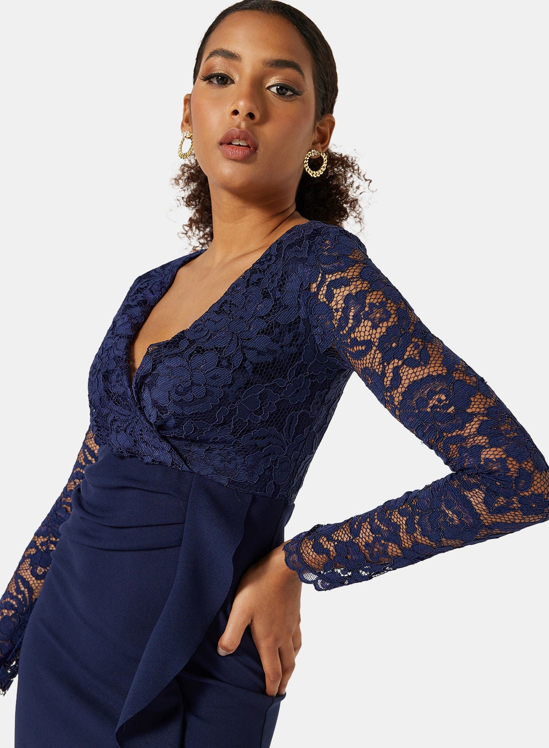 This product features a polyester blend fabric that is both durable and lightweight. It has a V-neck and long sleeves, with a lace fitted bodice and cascading ruffle detail. The back has a concealed zipper closure for a seamless look. To maintain its quality, please follow the care label instructions when washing. The model in the photo is approximately 178cm tall and is wearing a size 8.