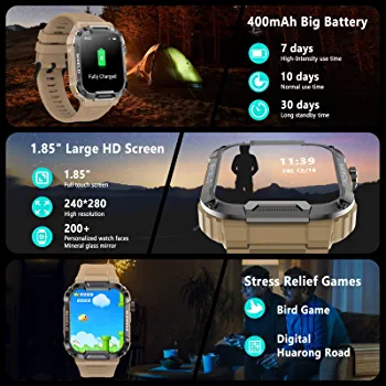 Our Military Smart Watch for Men is also waterproof, anti-dust, and anti-acid corrosion, making it the ultimate companion for conquering any environment. It features a stunning 1.85″ high-definition color touch screen with custom brightness adjustment and more than 200 beautiful built-in dials to suit your style. Create your own custom dials and flip your wrist to light up the screen and see prompt information in real-time.