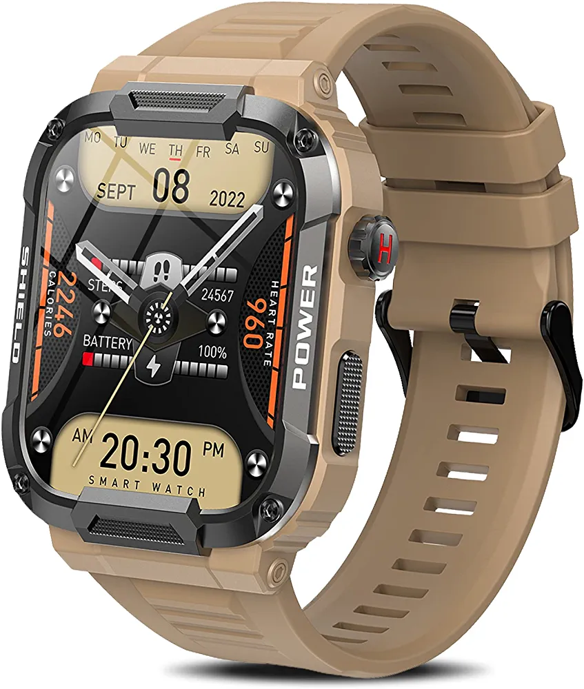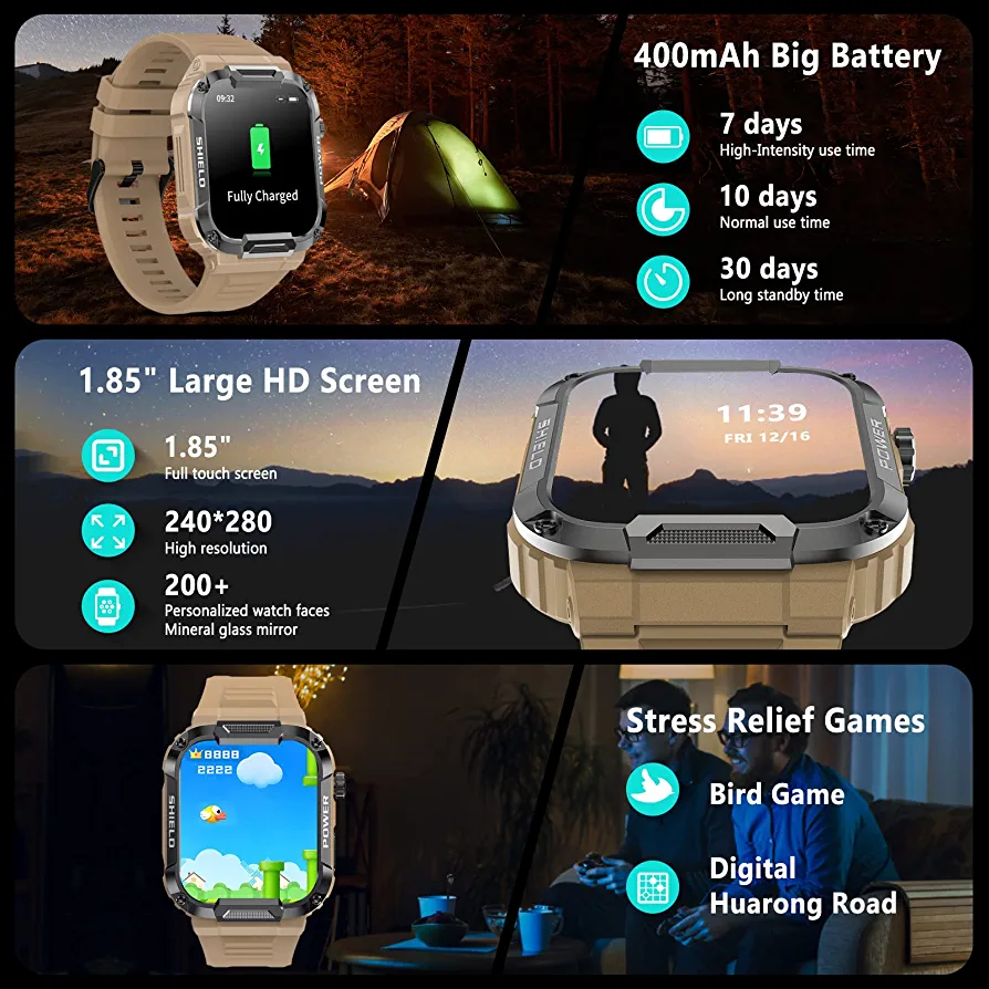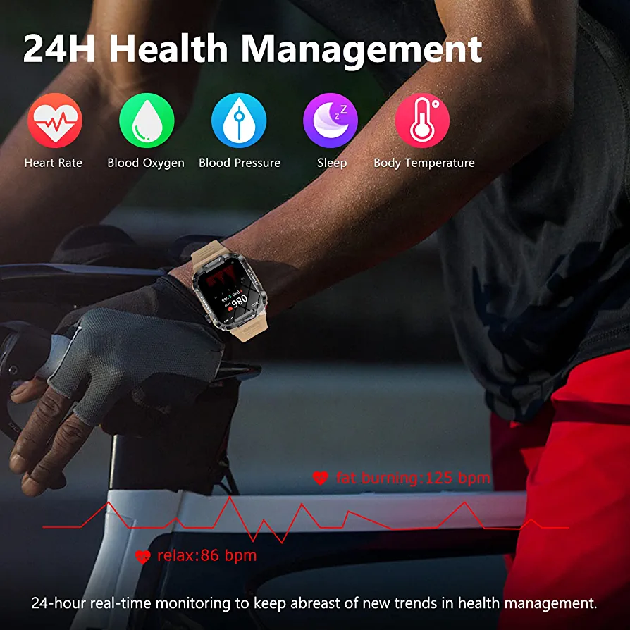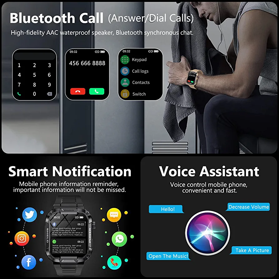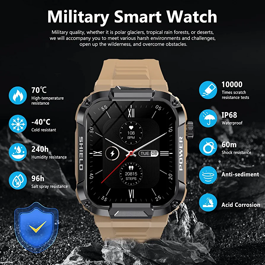 Introducing our Military Smart Watch for Men, the perfect companion for your active lifestyle. This rugged watch is designed to withstand harsh environments, extreme temperatures, and corrosive elements like salt spray. It has even been tested to endure drilling, drops, and car and bulldozer rolling.