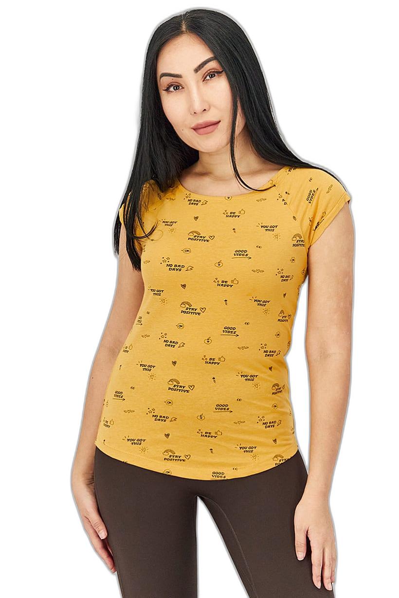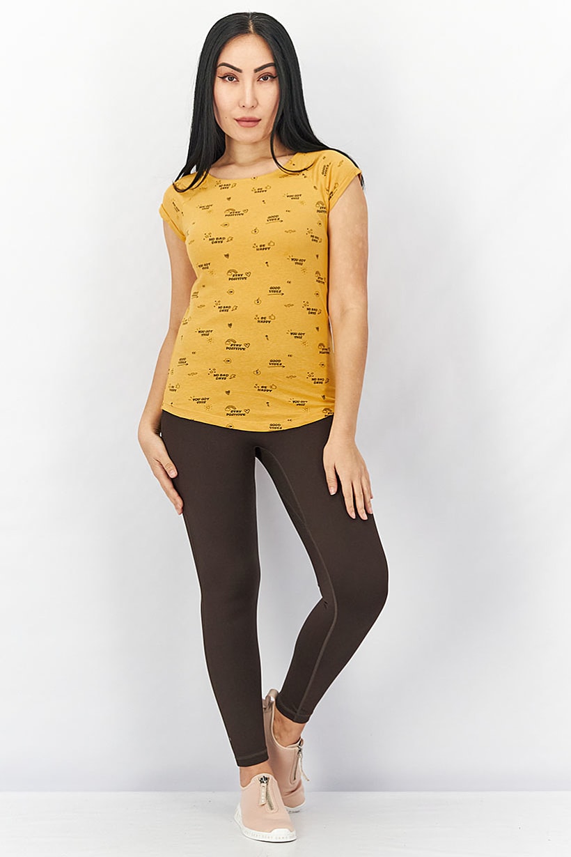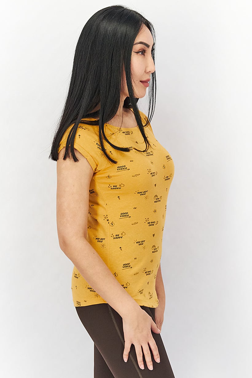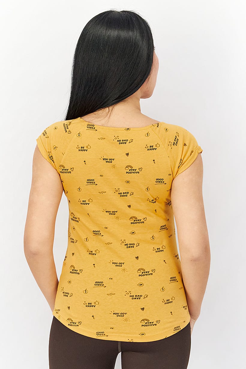 Care : Machine washable, Fit : Regular fit, Ideal For : Women, Size shown : International, Top Style : T-Shirt, Types of Hem : Straight hem, Types of Neckline & Collar : Round neckline, Types of Sleeve : Cap sleeve, Fabrics : 100% Cotton, Occasion : Casual, Pattern & Print : Allover print, Types of Closures : Pullover, Color Family : Yellow,