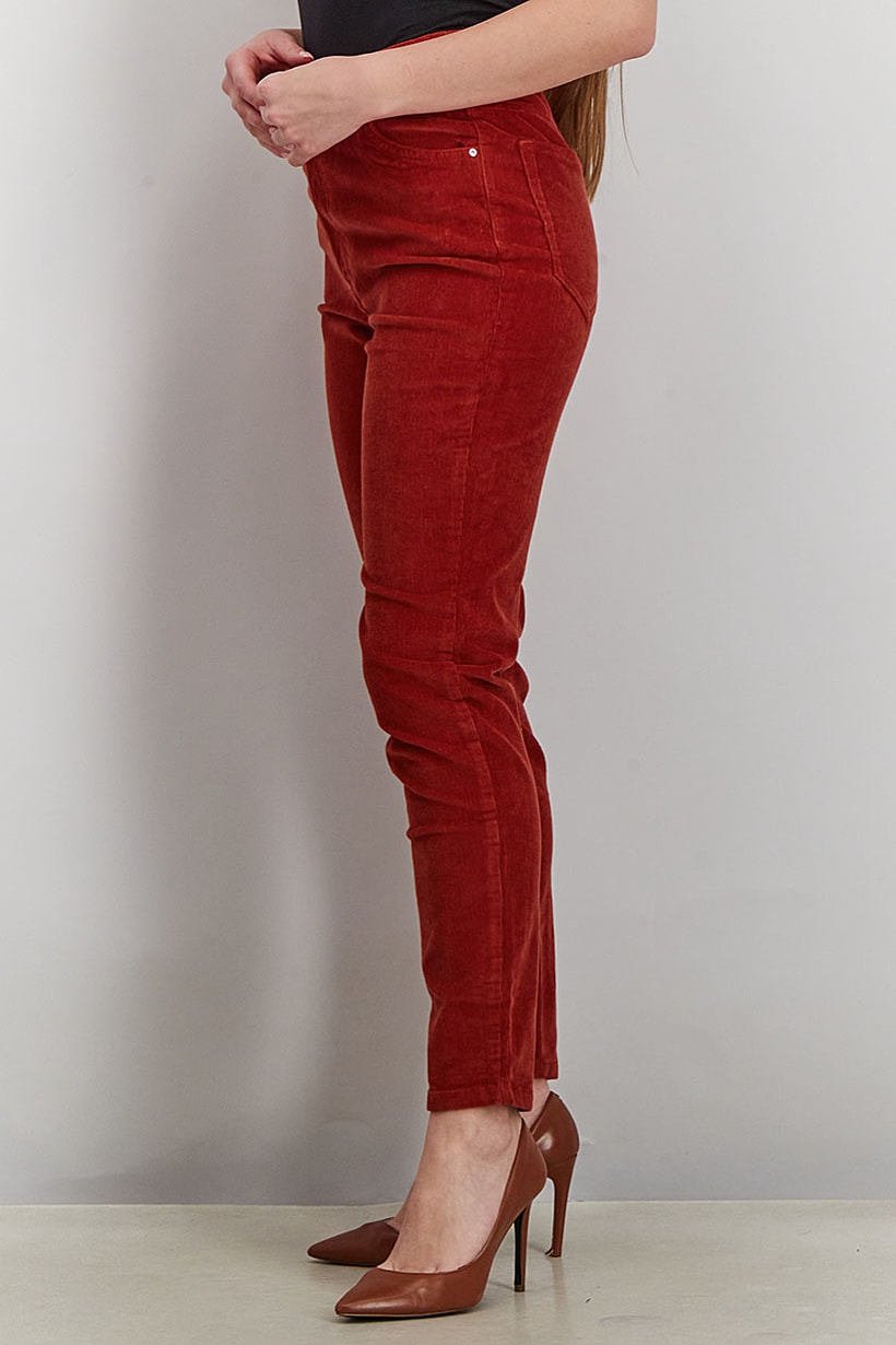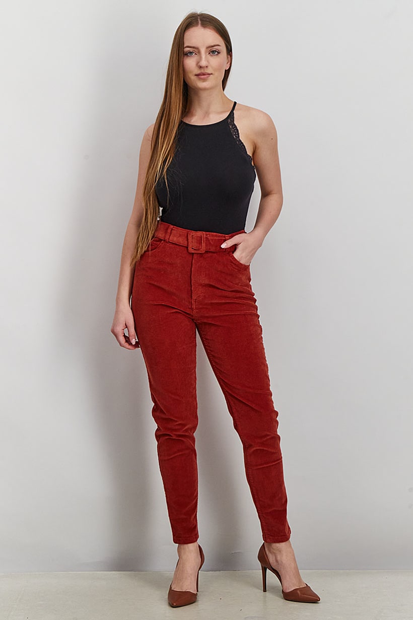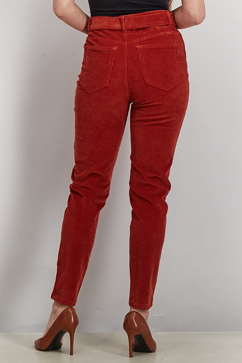 Rust Corduroy High-Waisted Pants for Women in Regular Fit.