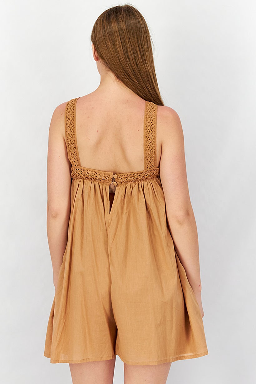 Care : Machine washable, Fit : Regular fit, Ideal For : Women, Jumpsuit Type : Playsuits, Size shown : US, Types of Sleeve : Sleeveless, Disclaimer : Product color may slightly vary due to photographic lighting sources or your monitor settings., Fabrics : 100% Cotton, Occasion : Casual, Pattern & Print : Plain/Solid, Types of Closures : Button, Color Family : Brown, Types of Neckline & Collar : Crisscross neckline,