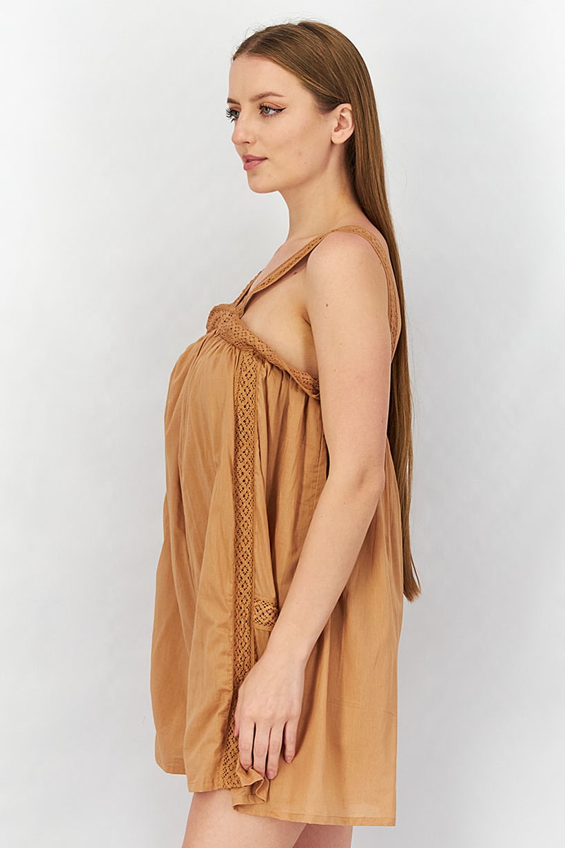 Women Pretty Lace Halter Sleeveless Swing Playsuit, Rust
