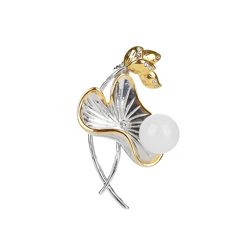 S925 silver gold plated Hetian white jade round beads Lotus Leaf Lotus ancient style retro high-end suit pin pendant dual-use