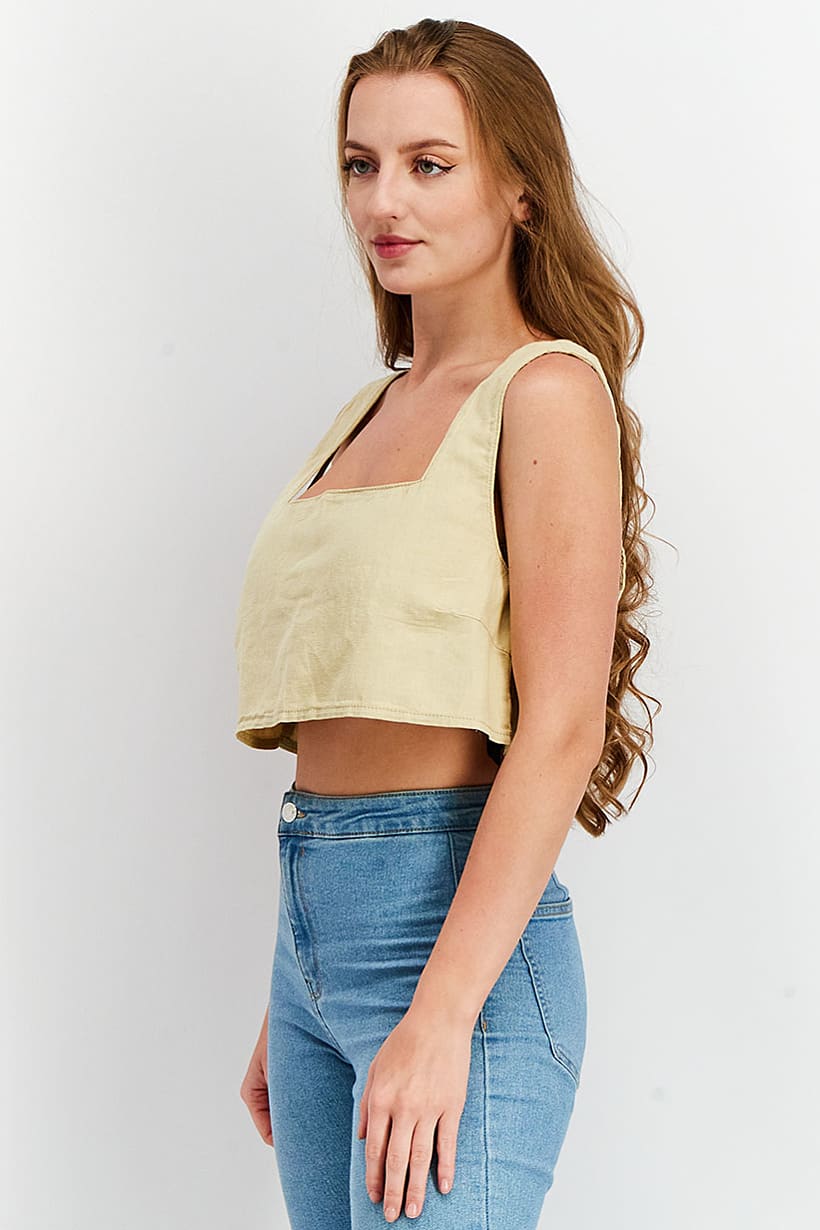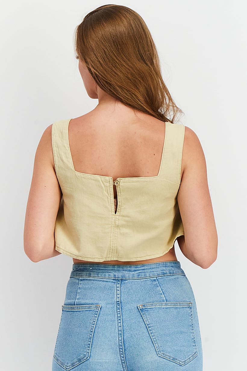 Care : Hand wash, Fit : Regular fit, Size shown : US, Top Style : Cropped, Types of Hem : Straight hem, Types of Neckline & Collar : Square neckline, Types of Sleeve : Sleeveless, Disclaimer : Product color may slightly vary due to photographic lighting sources or your monitor settings., Fabrics : 63% Cotton, 37% Linen, Occasion : Casual, Pattern & Print : Plain/Solid, Types of Closures : Button, Color Family : Olive,