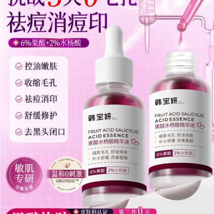 | nameOriginal | Salicylic acid fruit acid shrinks enlarged pores, repairs and protects essence, brushes facial acid, fades acne marks, blackheads and closes mouth |