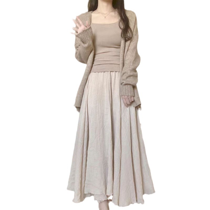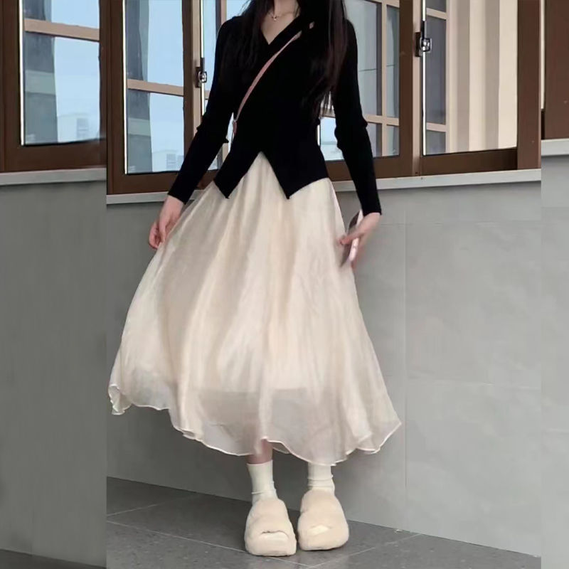 | nameOriginal | Salt-style Light Mature Summer Thin Black Knitted Top Mesh Pearlescent Skirt Slimming Western-style Two-piece Set |