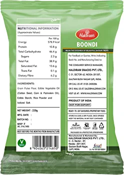 | descriptionOriginal | Haldirams Boondi Small and round bits of spicy besan batter, bursting with the flavour of red chilies. Boondi makes an excellent crunchy topping to various food items and beverages. |