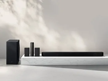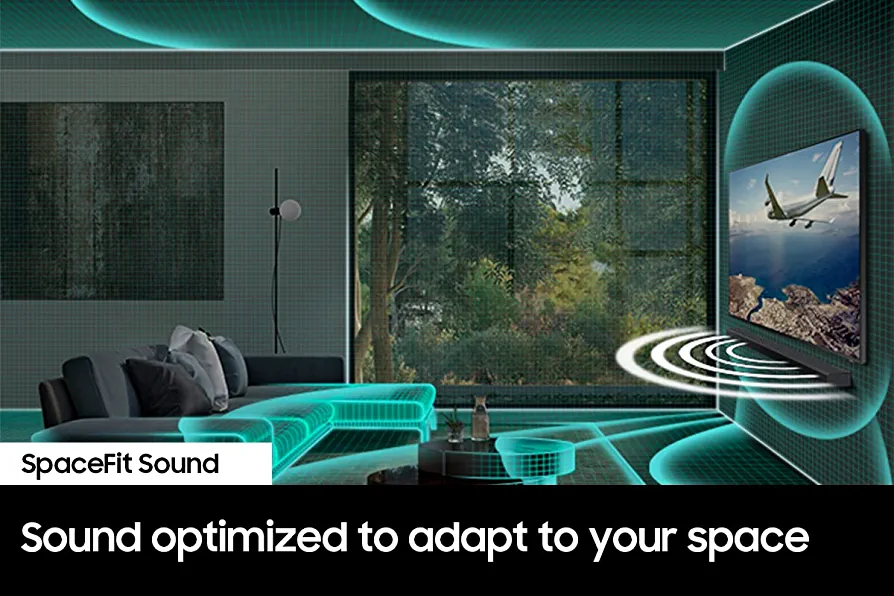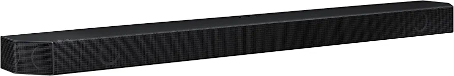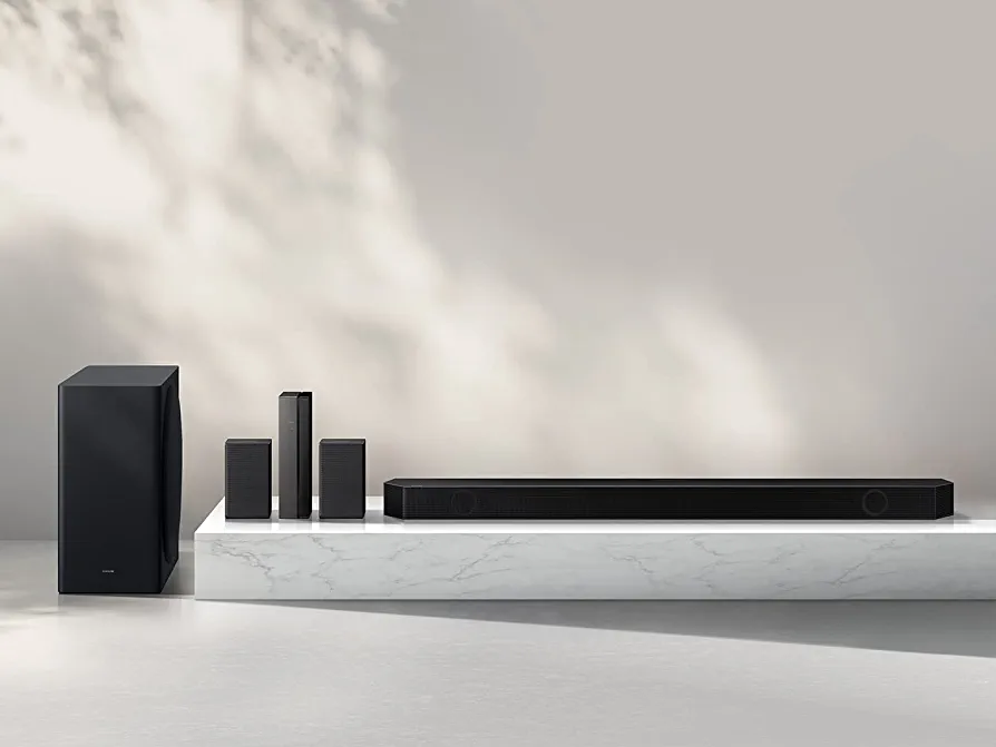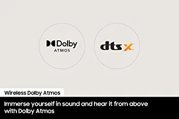 Transform your home entertainment experience with the Q910B soundbar featuring Wireless Dolby Atmos. This soundbar delivers true surround sound with 9 channels, 1 subwoofer, and 2 up-firing channels, without the need for HDMI cables. The immersive audio fills your room from every angle, utilizing every speaker in compatible Samsung TVs and soundbars. The included up-firing rear speakers project sound all around you, creating a fully immersive experience. With Adaptive Sound, you can enjoy optimized audio with enhanced voice clarity, perfect for action-packed games and blockbuster films. Game Pro Mode takes your gaming experience to the next level with up-firing speakers and 3D audio that moves all around you. Acoustic Beam® and powerful woofers sync sound with the action onscreen, allowing you to react instantly in real-time. You can also play your favorite music, videos, or podcasts from your mobile device to your soundbar with a simple tap. The Q-Symphony feature is compatible with select 2020-2022 Samsung TVs, and the soundbar must be connected to the TV via HDMI to enable this function. SpaceFit Sound is built-in, and Content Services may vary by region and are subject to change without notification. This Samsung Soundbar supports AirPlay2 and requires iOS 11.4 or later.