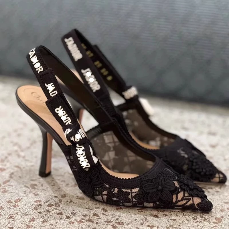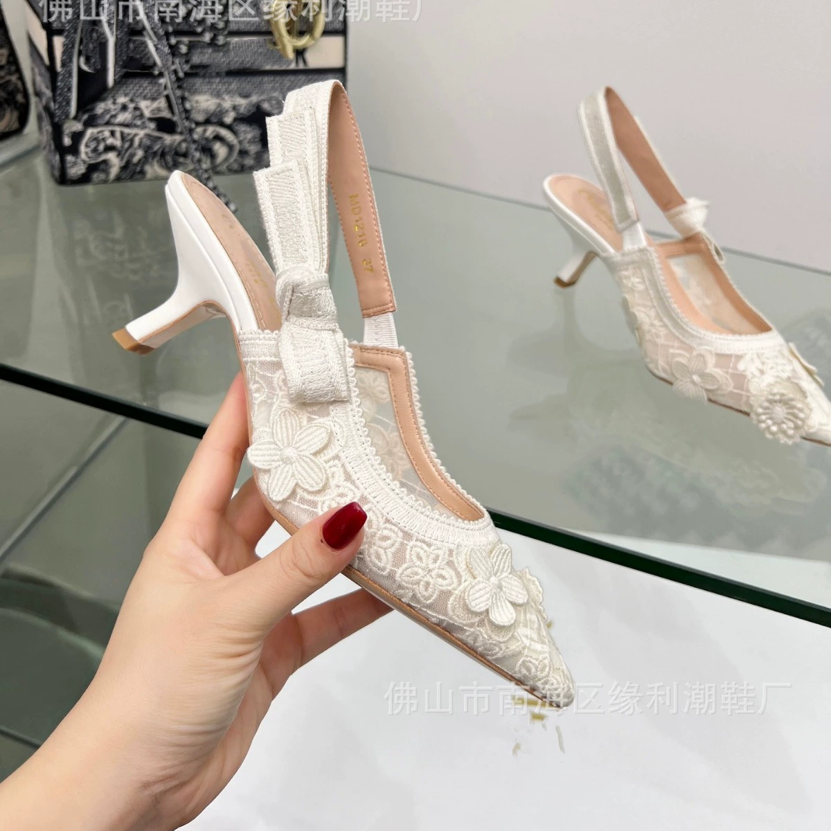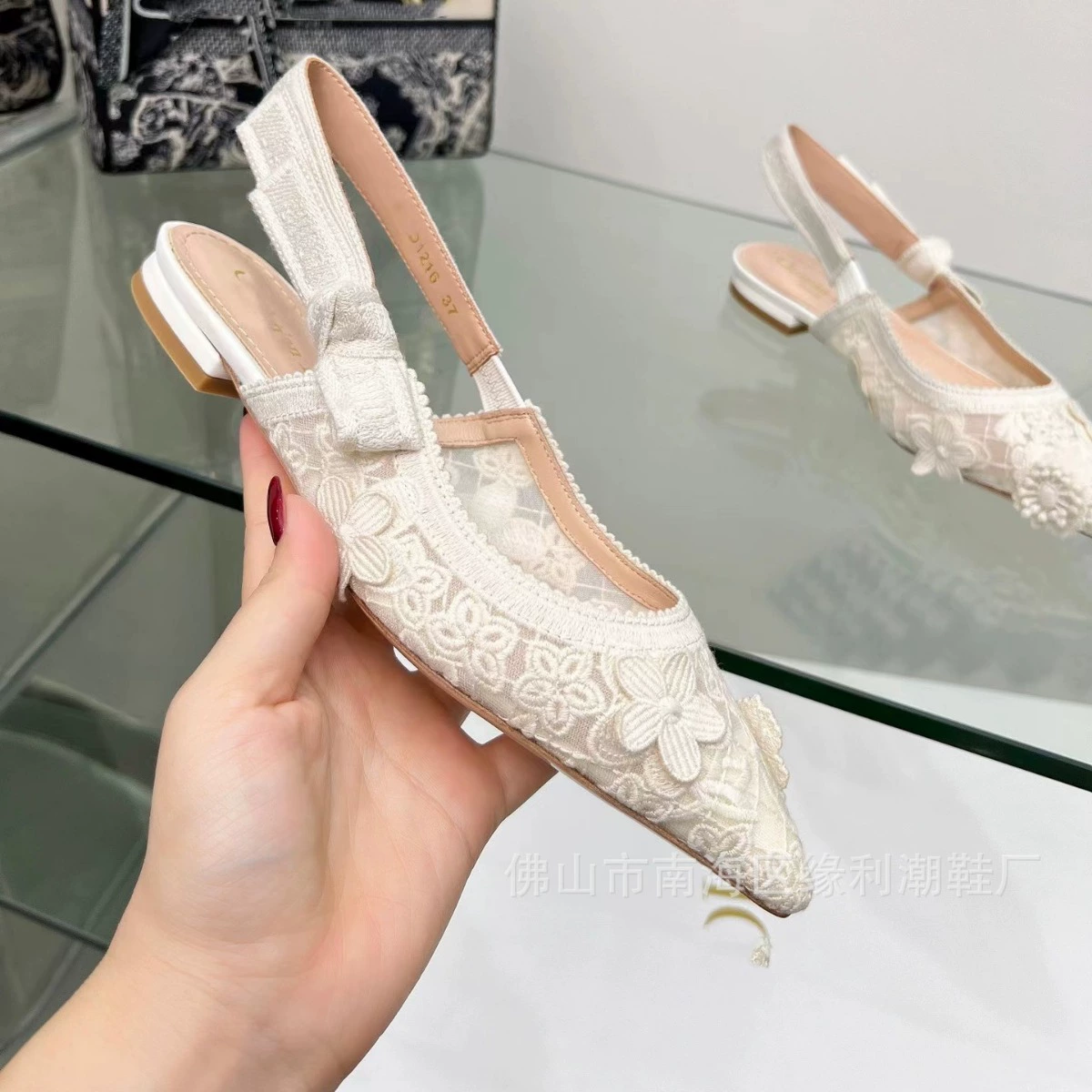 D letter sandals with bow tie for women 2024 home spring new black retro elegant mesh flower high heels