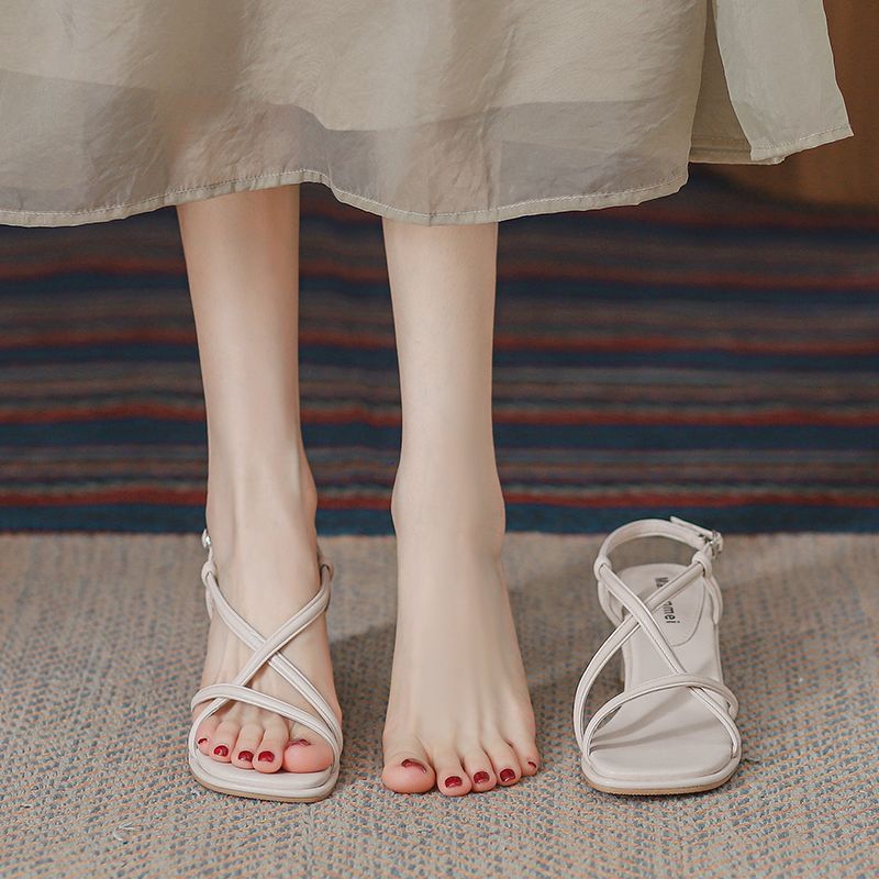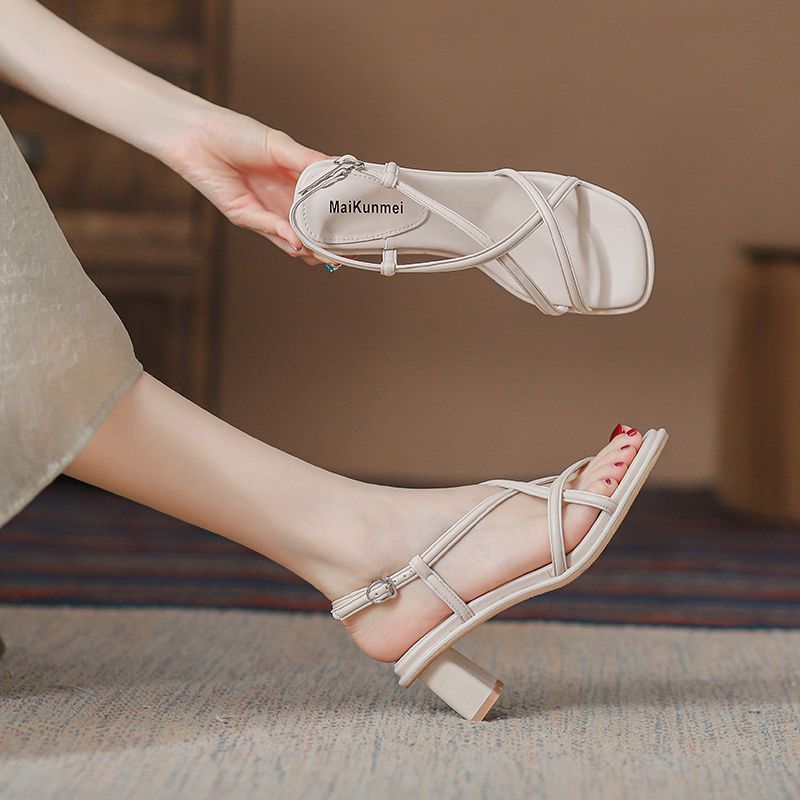Sandals Women’s Outwear 2024 Summer New Soft Sole Mid-Heel Roman Elegant Skirt Thick Heel French High Heels