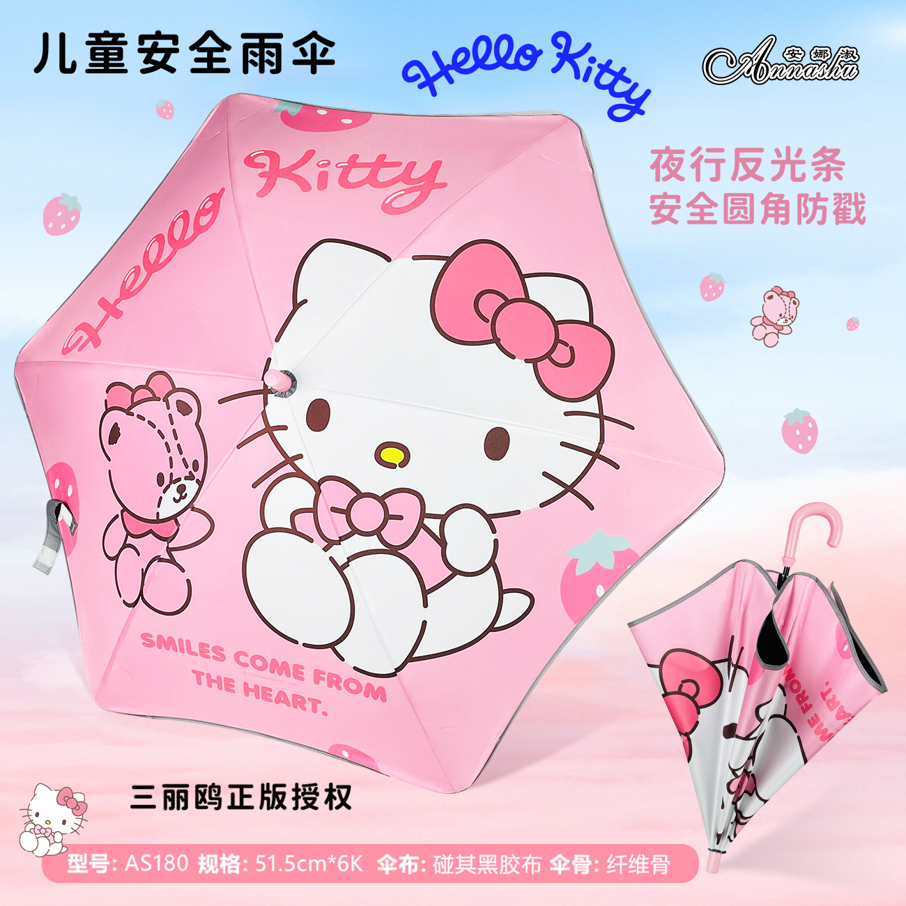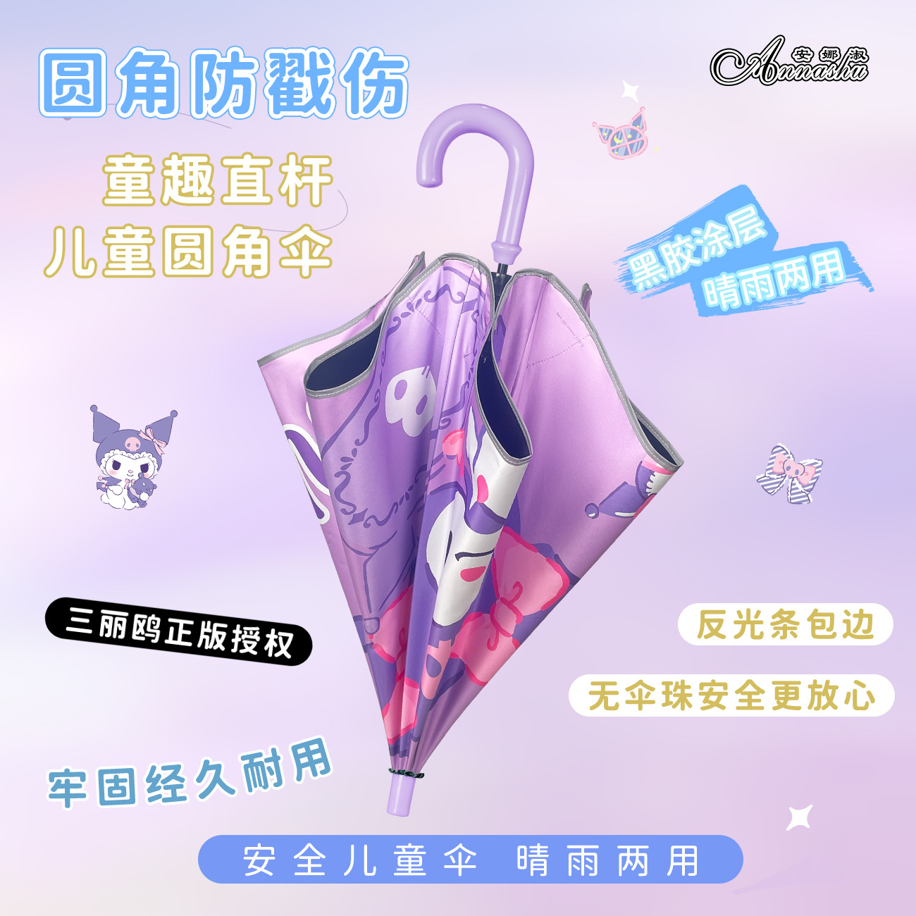 Sanrio Genuine Kulomi Cartoon Series Straight Handle Black Rubber Sunscreen Children's Reflective Strip Rounded Edge Safety Children's Umbrella
