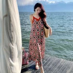 Sanya seaside beach dress vacation bohemian long dress female super fairy ethnic style retro printed suspender dress