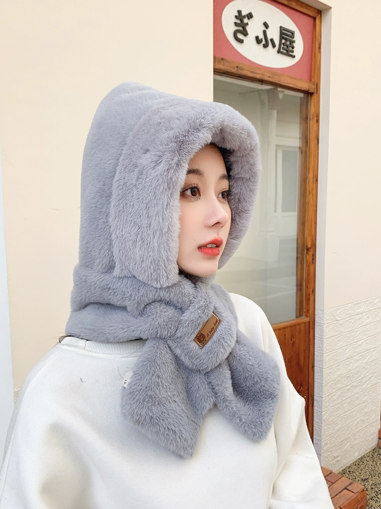 Scarf and hat integrated autumn and winter warm plush thick imitation rabbit fur cute ear protection hat 2024 hot style women