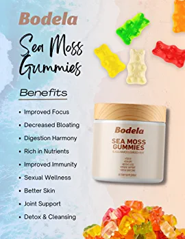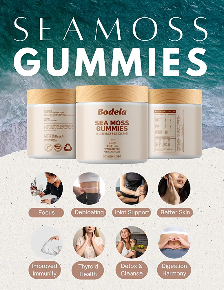 Our Sea Moss gummies are a top-quality dietary supplement that contains 92 of the 102 essential vitamins and minerals required for optimal human health. Sea Moss, a nutrient-dense seaweed variety, is well-known for its exceptional health benefits, making it an ideal ingredient for our gummies. In addition, our gummies contain other fantastic ingredients like burdock root and bladderwrack, which offer numerous benefits such as improved focus, reduced bloating, digestive harmony, and joint support, among others. Our gummies are an excellent source of nutrients that promote improved immunity, sexual wellness, better skin, detox, and cleansing. You can rely on our Sea Moss gummies to provide you with the necessary nutrients to support your health and wellness goals. The benefits of these ingredients include being rich in nutrients, improving immunity, sexual wellness, better skin, joint support, detox, and cleansing.