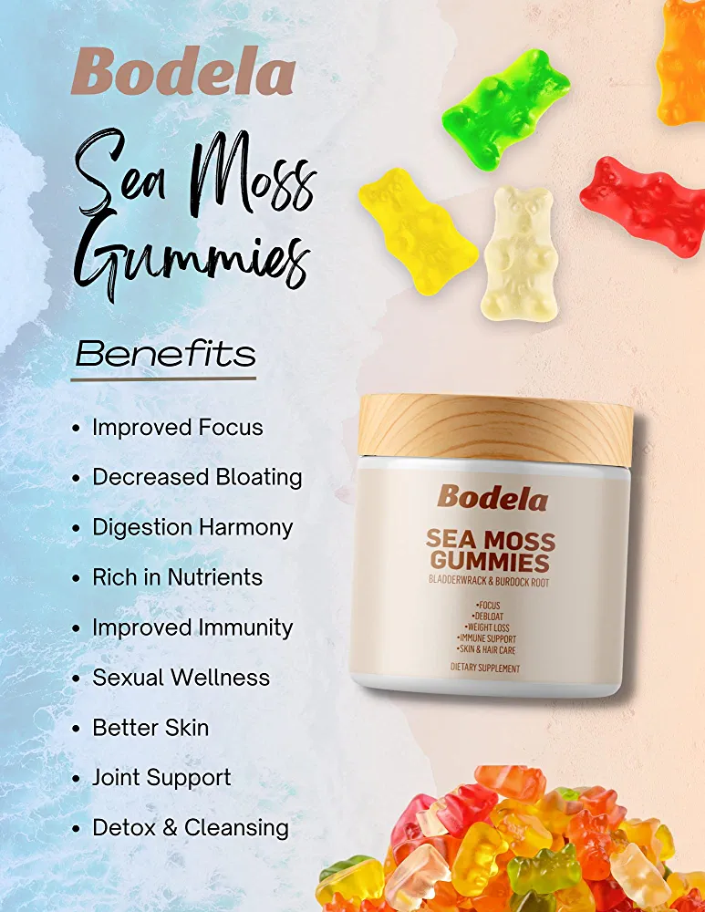 | descriptionOriginal | Description Our Sea Moss gummies are a premium superfood supplement that contains 92 out of 102 essential vitamins and minerals necessary for optimal human health. Sea Moss, a nutrient-dense type of seaweed, is renowned for its exceptional health benefits, making it an ideal ingredient for our gummies. Additionally, our gummies feature other fantastic ingredients such as burdock root and bladderwrack, which offer numerous benefits such as improved focus, decreased bloating, digestion harmony, and joint support, among others. Our gummies are an excellent source of nutrients, promoting improved immunity, sexual wellness, better skin, detox, and cleansing. Trust our Sea Moss gummies to provide you with the necessary nutrients to support your health and wellness goals. The benefits of these ingredients include: Rich in Nutrients, Improved Immunity, Sexual Wellness, Better Skin, Joint Support Detox & Cleansing |