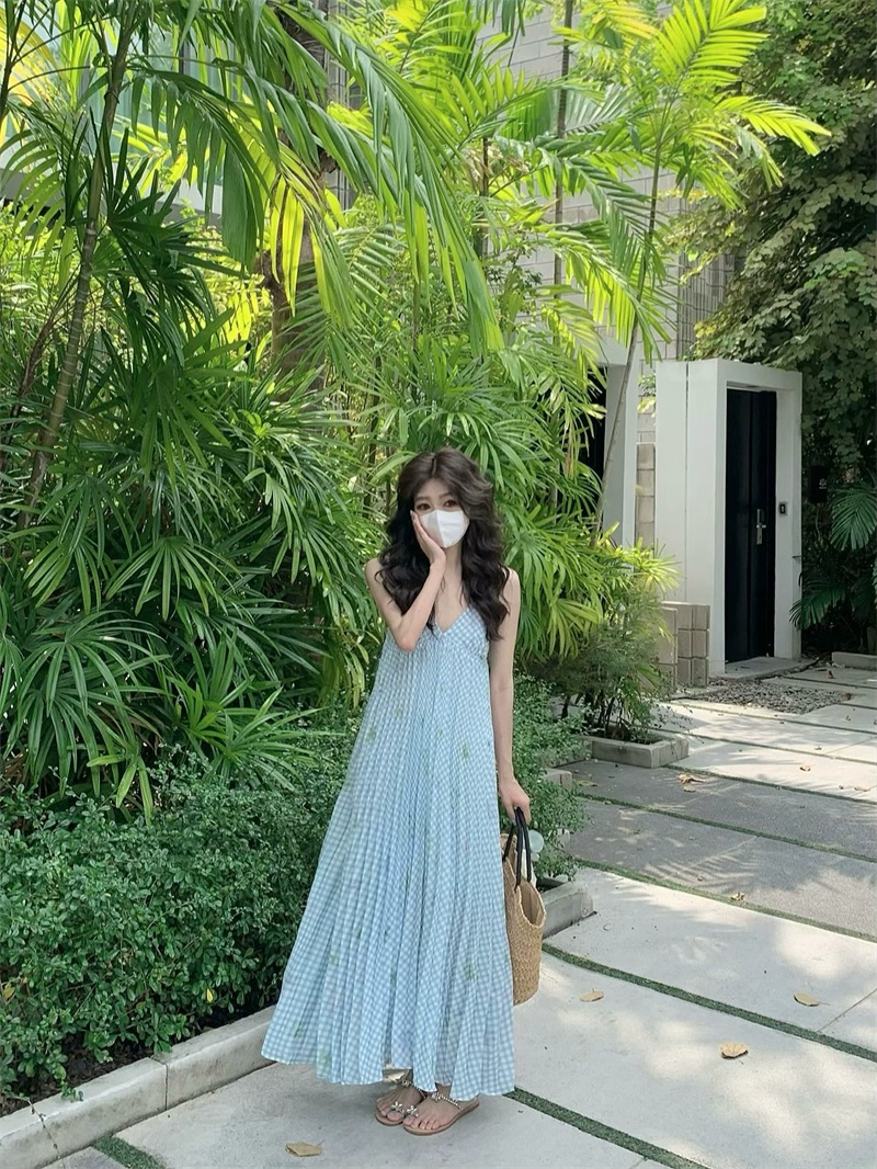 | nameOriginal | Seaside resort style summer loose long skirt with V-neck suspenders |