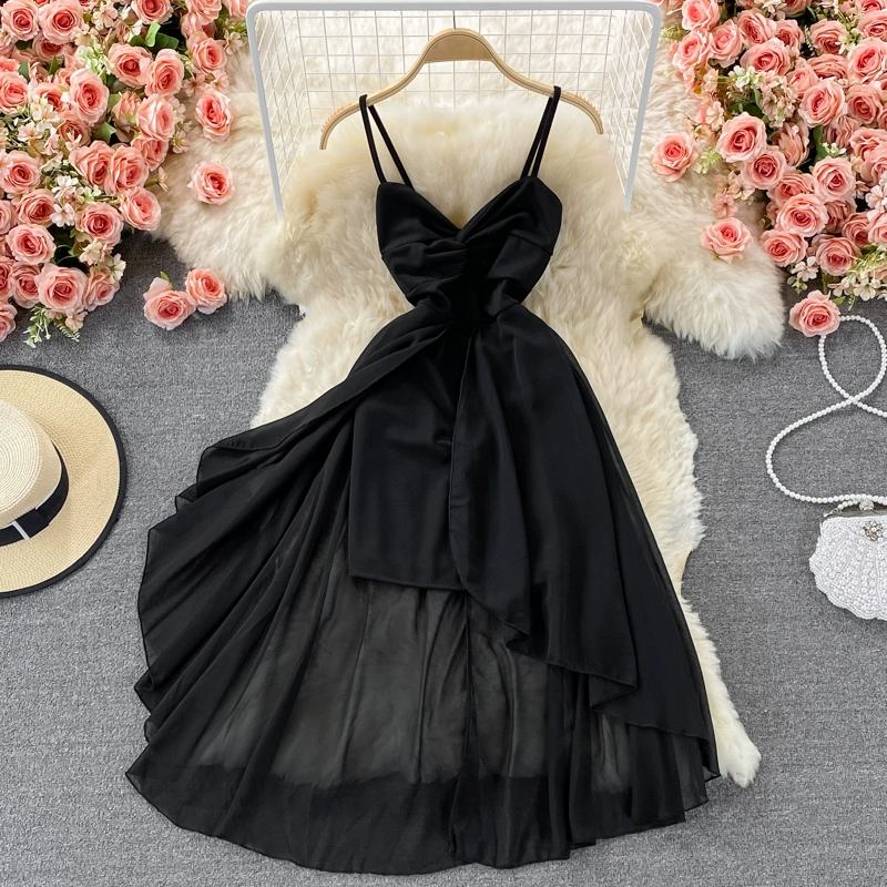 Seaside vacation beach dress, temperament v-neck backless suspender dress, high waist slimming ruffled twist backless dress