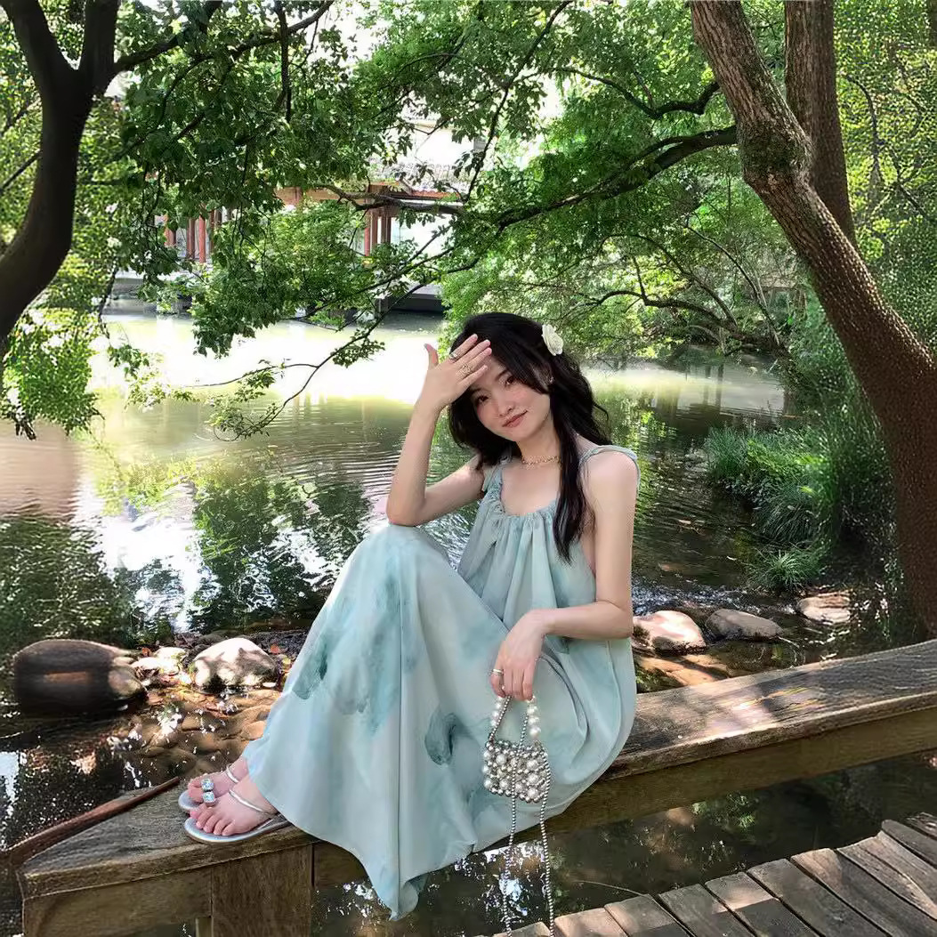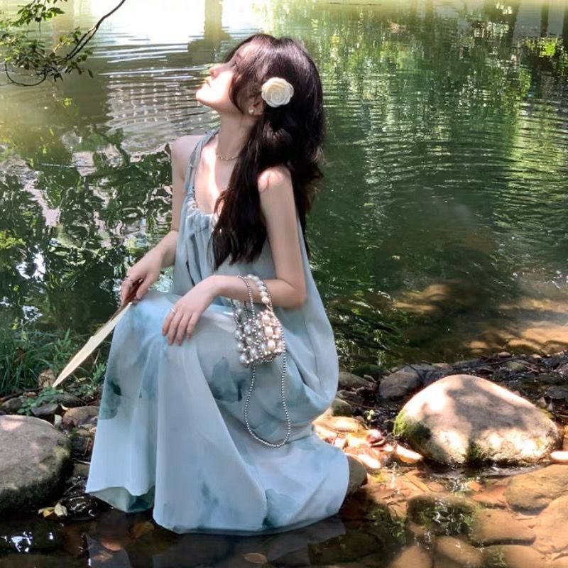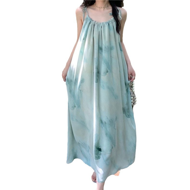 | nameOriginal | Seaside Vacation Tie-Dye dress Women's Summer French A- line Loose Slim-fit Beach Dress Sleeveless Long Skirt with Strap |