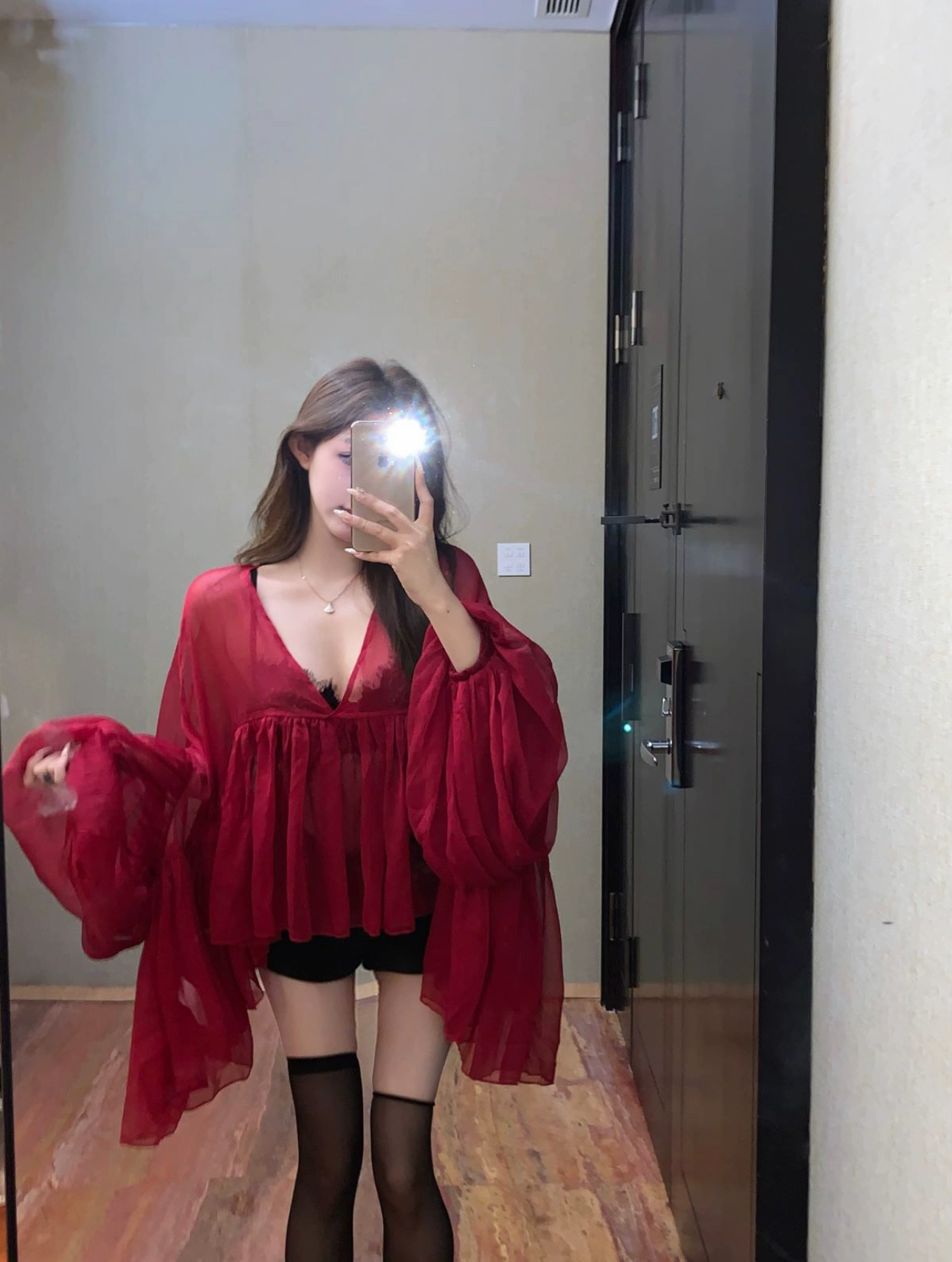 See-through V-neck long-sleeved loose tulle top chiffon shirt