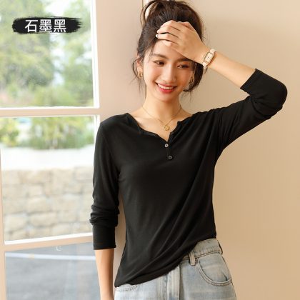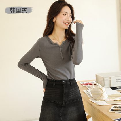 Semi-Open Collar Knitted Base Shirt Slim-Fit Slimming Inner Long-Sleeved T-Shirt Stylish Outer Wearing Top Trendy V-Neck Small Shirt T-Shirt