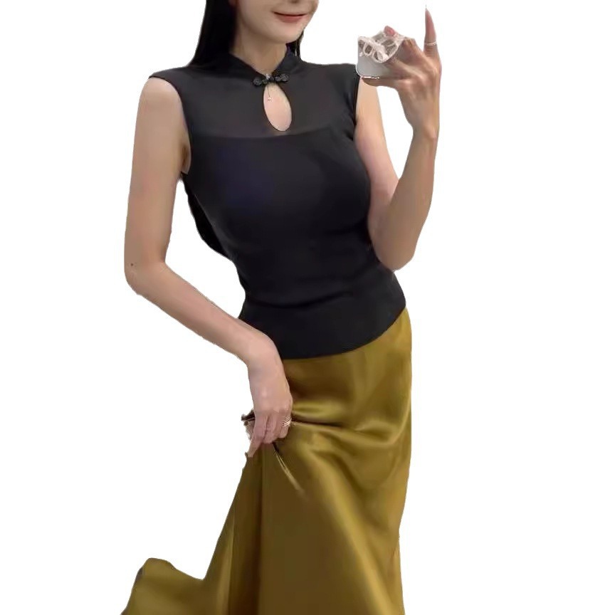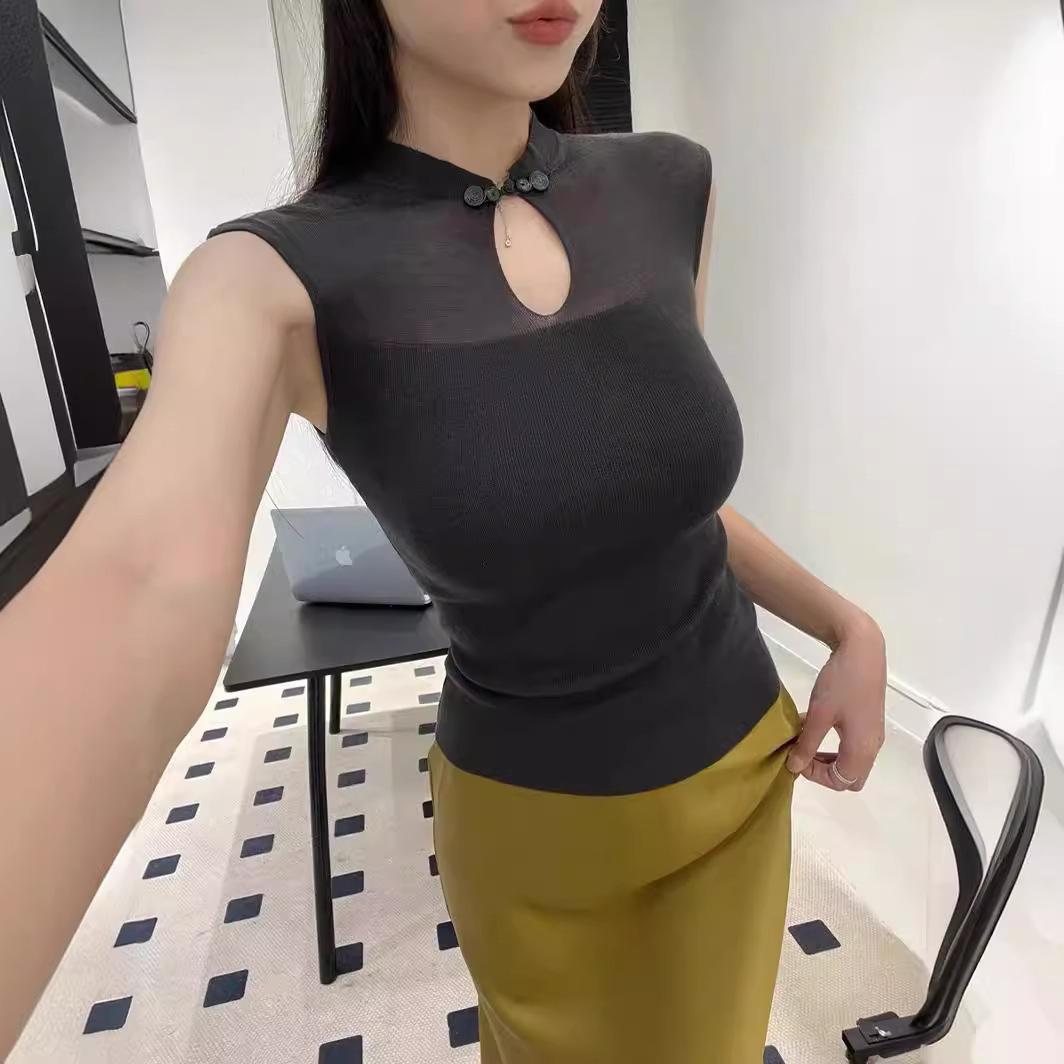 | nameOriginal | Sense new Chinese stand collar buckle small fly sleeve T-shirt top 2024 summer new waistcoat women's knitted vest |