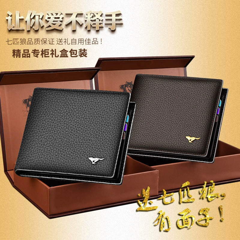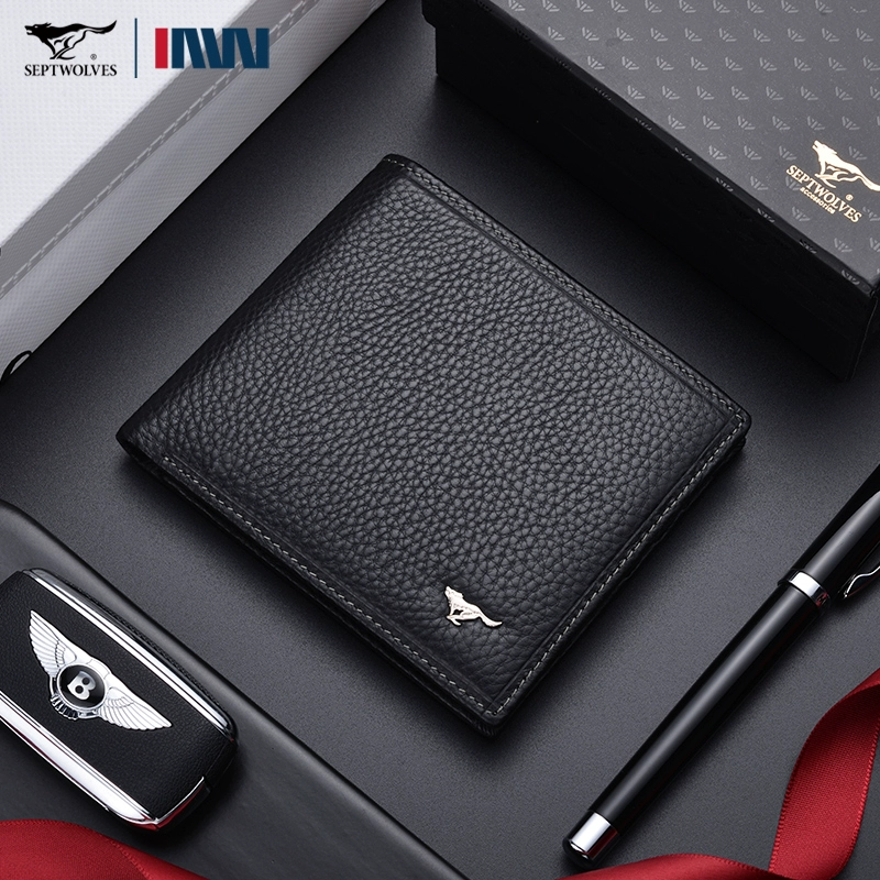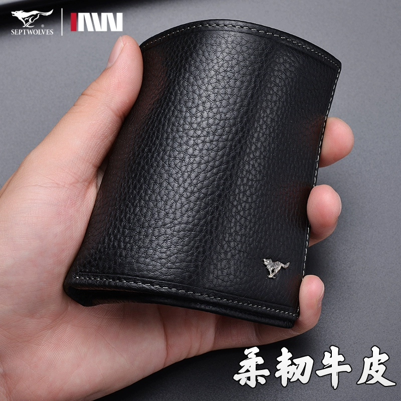 Septwolves men’s genuine leather short wallet 2024 new simple wallet first layer cowhide card bag youth wallet trend
