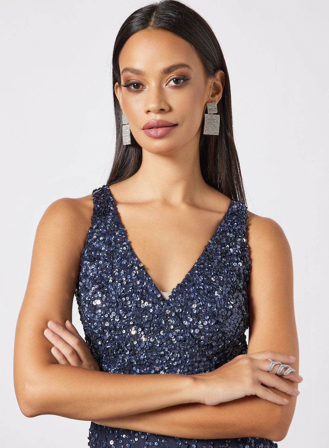 This product features a polyester fabric adorned with sequin embellishments. It has a V-neck and sleeveless design, with a concealed zipper closure at the back. The bodice is fitted and the length is maxi. Please follow the care label instructions when washing. The model in the photo is approximately 178cm tall and is wearing a size 8.