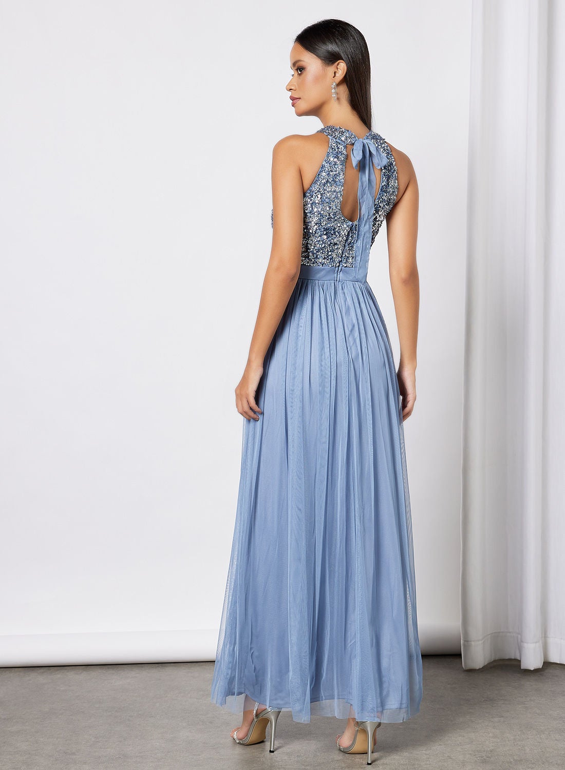 This product features a lightweight and cozy polyester fabric that provides comfort. It has a halter neck design with a tie-up detail at the back, and the bodice is adorned with sequins. The back has a concealed zipper closure for easy wearing. To maintain its quality, please follow the care label instructions when washing. The model in the picture is approximately 178cm tall and is wearing a size 8.