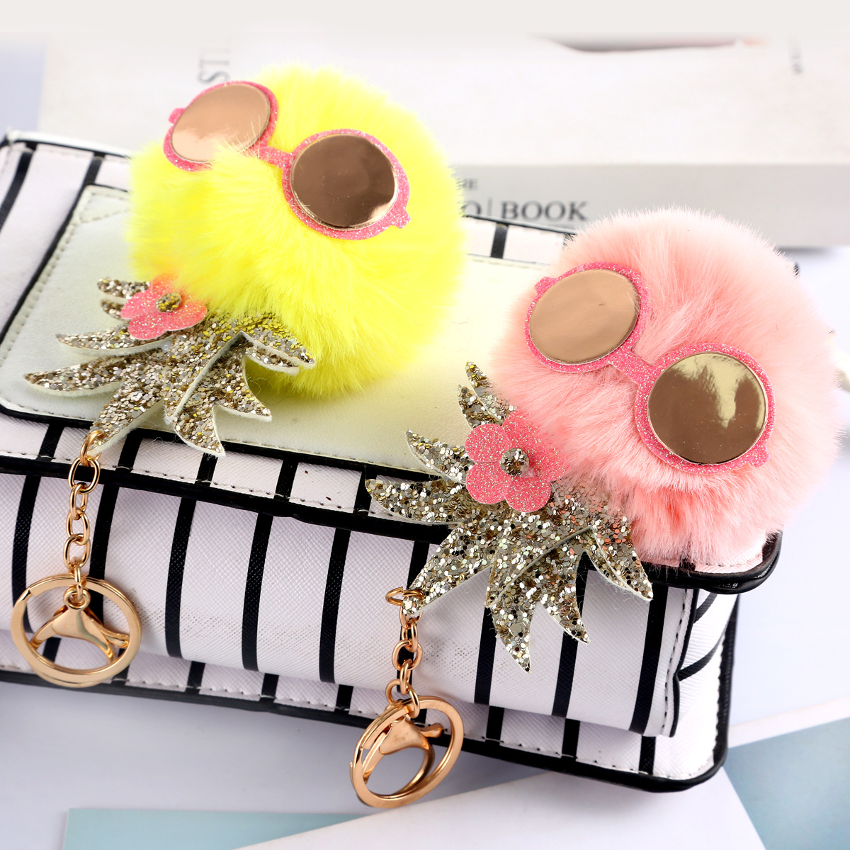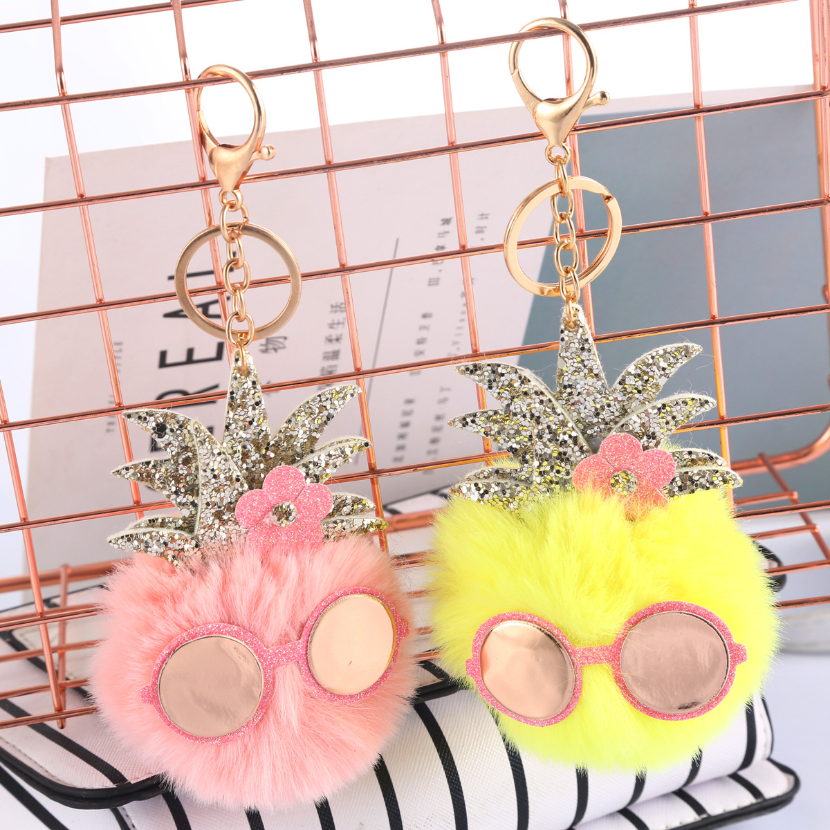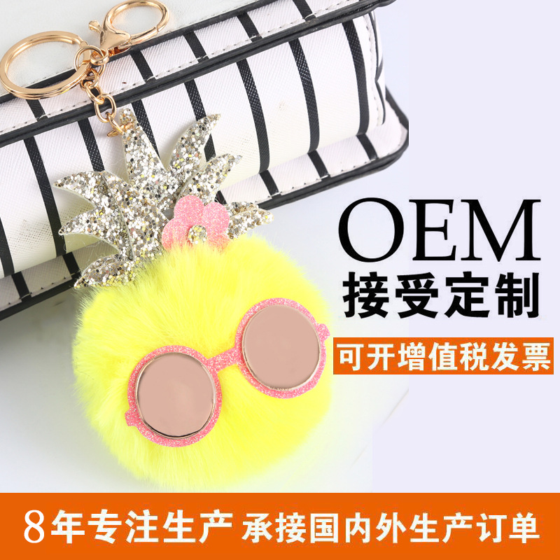 | nameOriginal | Sequin Pineapple Leaf Sunglasses Fur Ball Keychain Pendant Girl Gloss Glasses Cat Car Keychain |