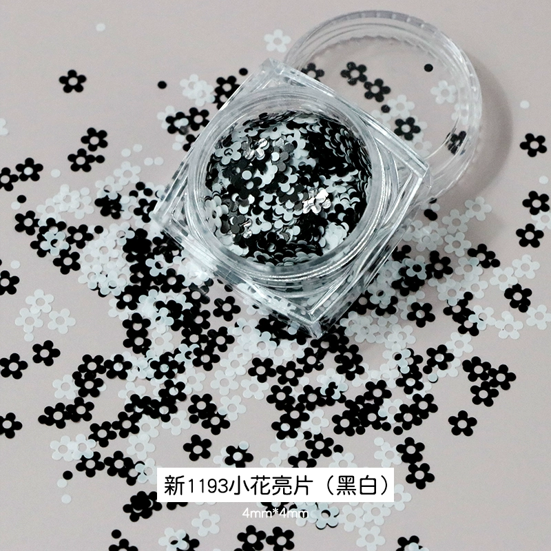 | nameOriginal | Sequin Sky Realm Small Petals Black and White Manicure |