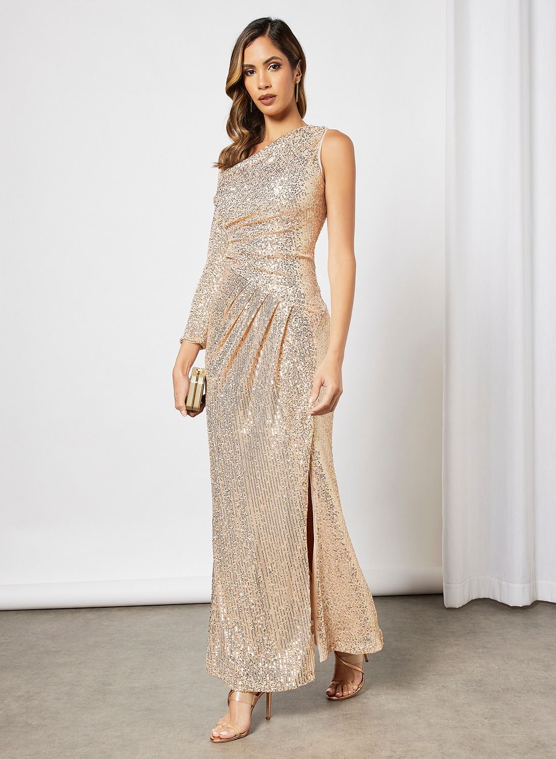 Introducing the stunning Jaded Rose Bailey Sequin Maxi Dress in a gorgeous rose gold hue. This dress features a single shoulder design and is adorned with full sequins for a glamorous look. The model in the photo is wearing a size S UK.