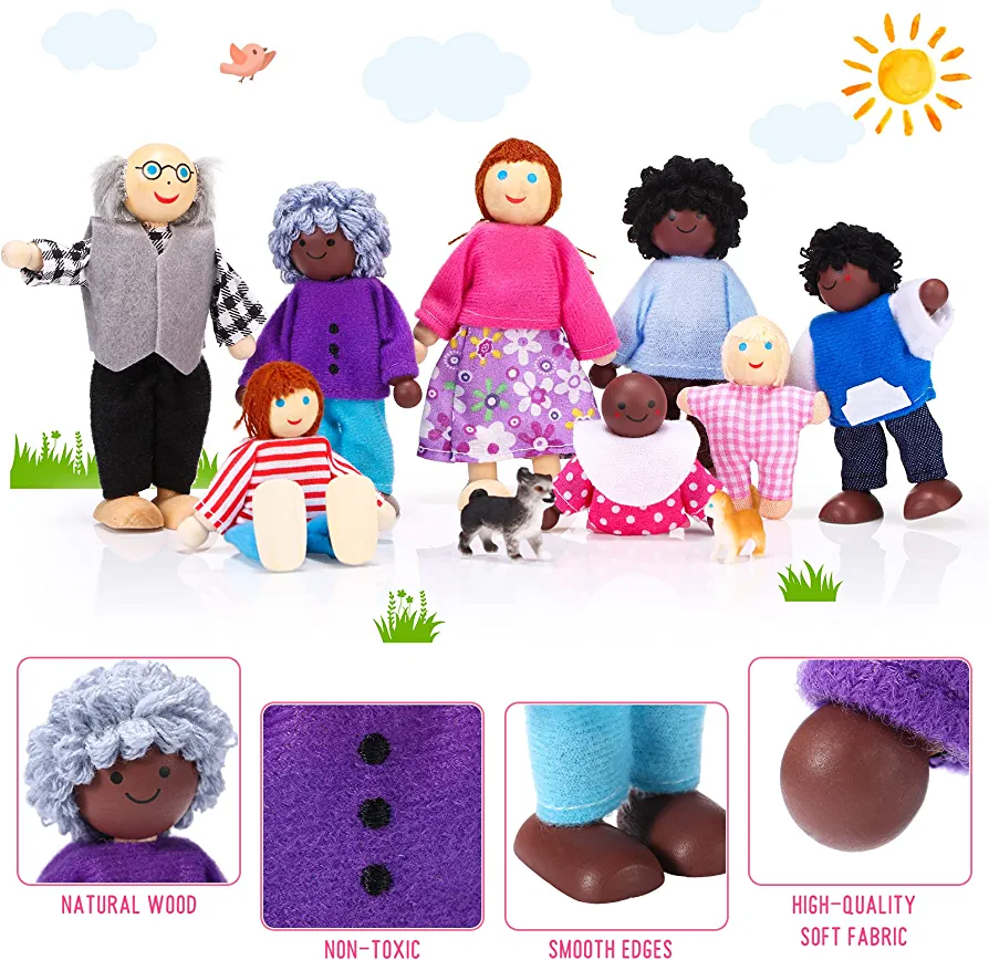 This educational toy kit is perfect for stimulating creativity and imagination in children. It features a set of little family people that can be used as a birthday or holiday gift for boys and girls. The wooden doll house accessories are designed in multicultural styles, which helps children recognize the dressing up characteristics of people from different cultures and understand the diversity of the world.