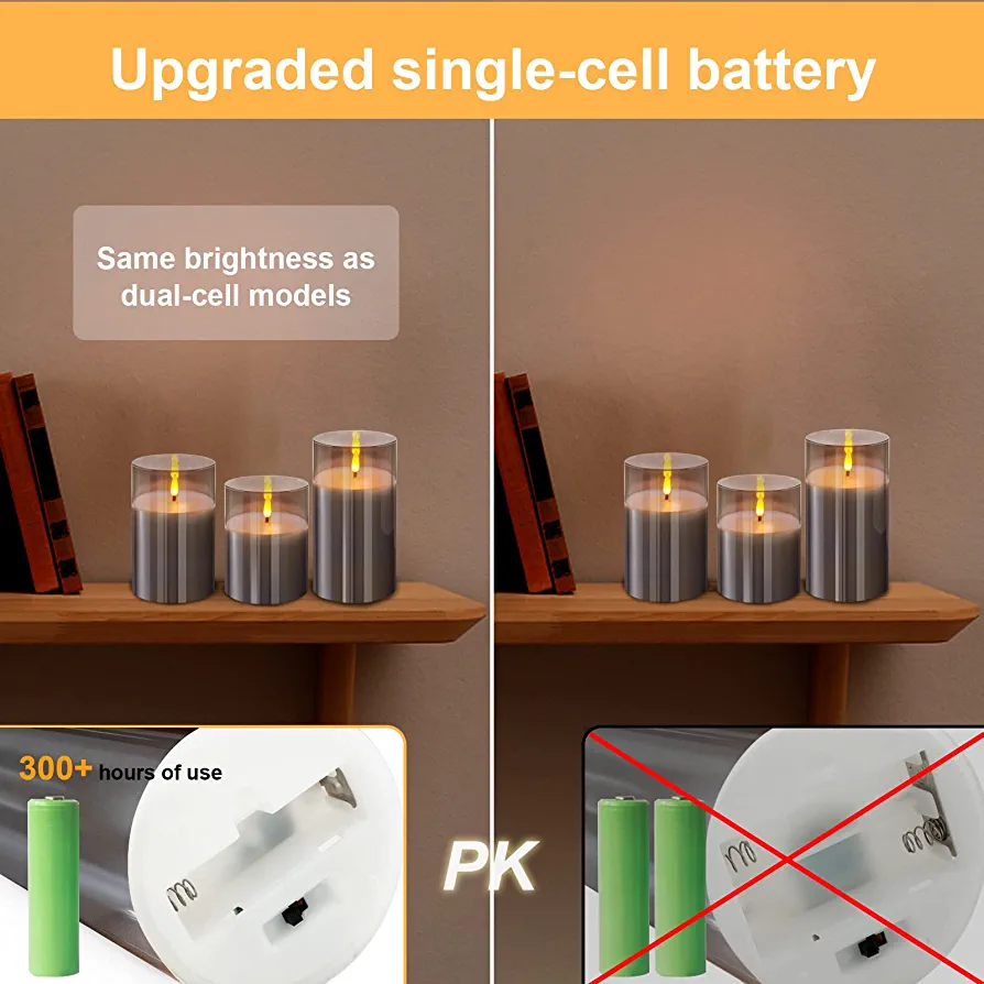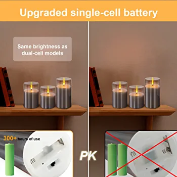 Upgraded version – Single battery:Introducing our flameless candles with an advanced battery technology that lasts over 300 hours on just one single battery! That's right, unlike other brands that require two batteries, our candles are powered by only one battery without compromising on brightness. Not only is this energy-saving feature practical and convenient, but it also makes our candles a cost-effective choice.