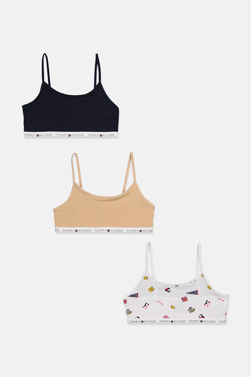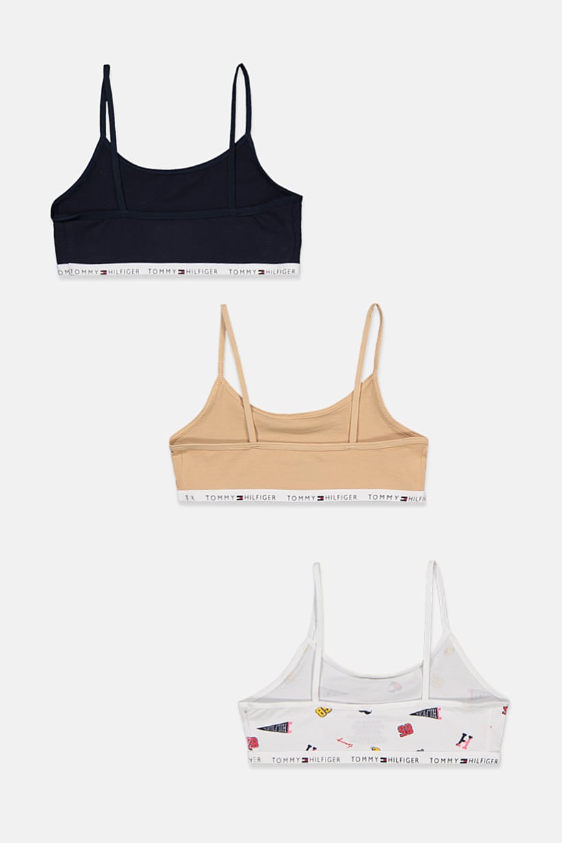 Set of 3 printed brand logo bralettes for girls in white, nude, and navy colors.