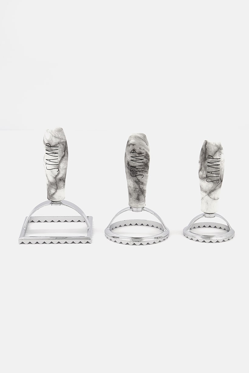 | sub_Categories | Kitchen & Dining, Kitchen Tools & Gadgets, 3 pieces ravioli cutter stamp set with cutters wooden handles white silver |