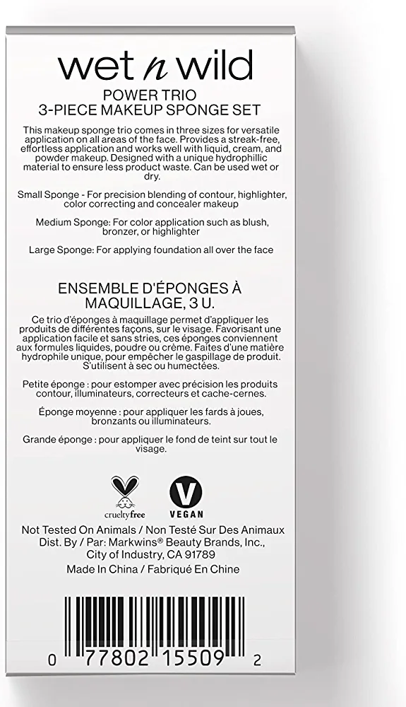 | descriptionOriginal | Description Always have the right tool on hand, every time with this 3-piece makeup sponge set. Featuring a size for every job, whether you’re applying foundation all over the face or getting close for contouring. Made from a unique hydrophilic material to ensure less product waste, these sponges can be used wet or dry with any liquid, cream, or powder makeup. wet n wild starts as everyone’s first and remains a lifelong destination for vibrant and accessible beauty. Delivering over 40 years of trend-forward and all-inclusive innovations, we are your trusted beauty expert that will keep you looking fabulous without ever betraying your budget. From the bold ‘n’ bright to the neutral ‘n’ nuanced, we set out to spoil you with options while setting the gold standard of achievability. So go ahead, get your feet wet with us again and go wild with your imagination! |
