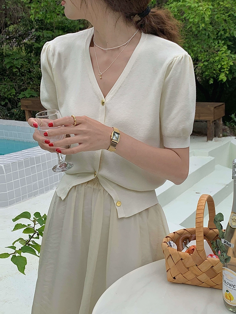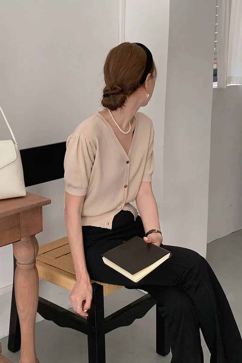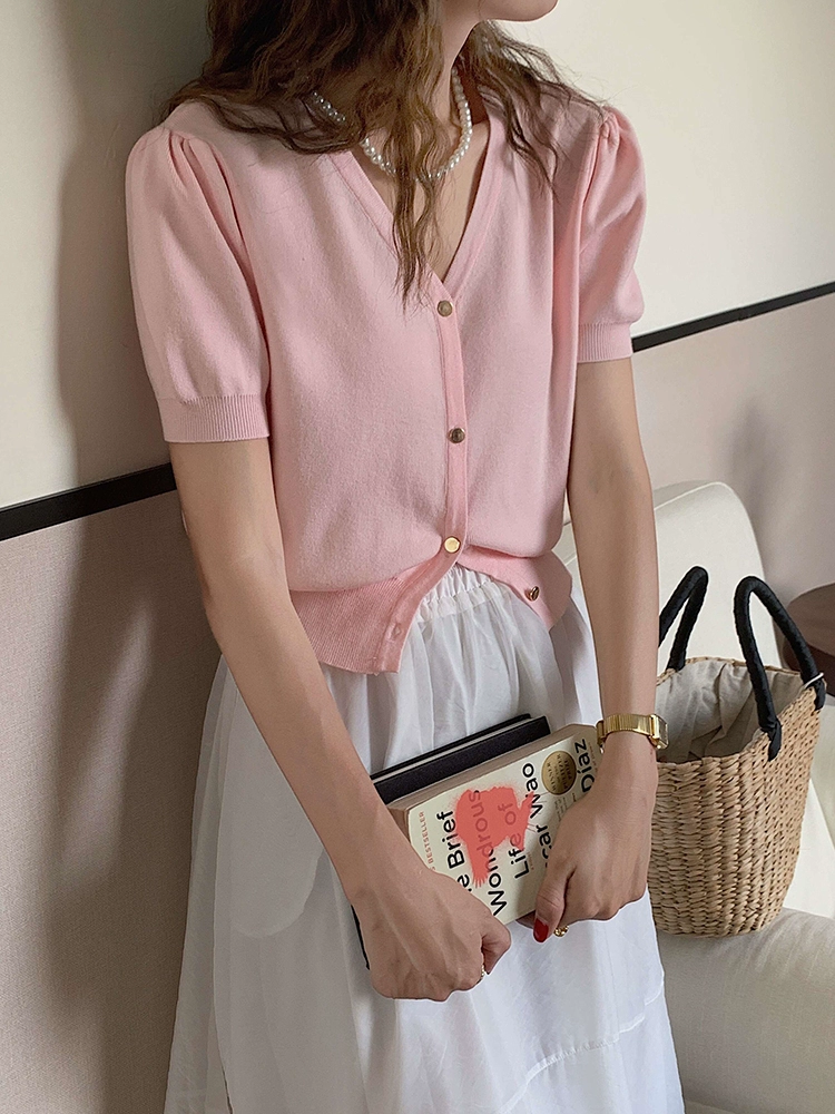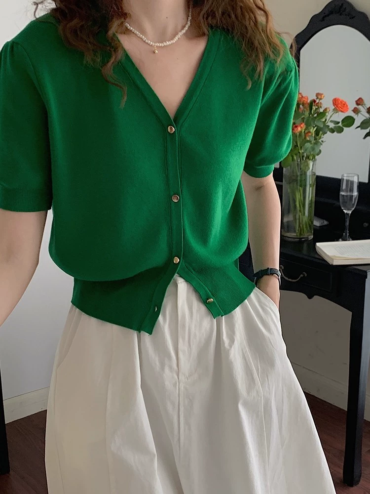 Seven Sheep Summer Ice Silk Short Sleeve V-neck Black Knitted Cardigan Women's Thin Short Puff Sleeve Top