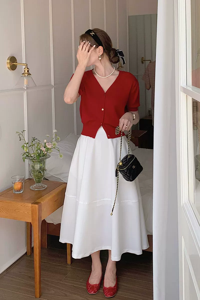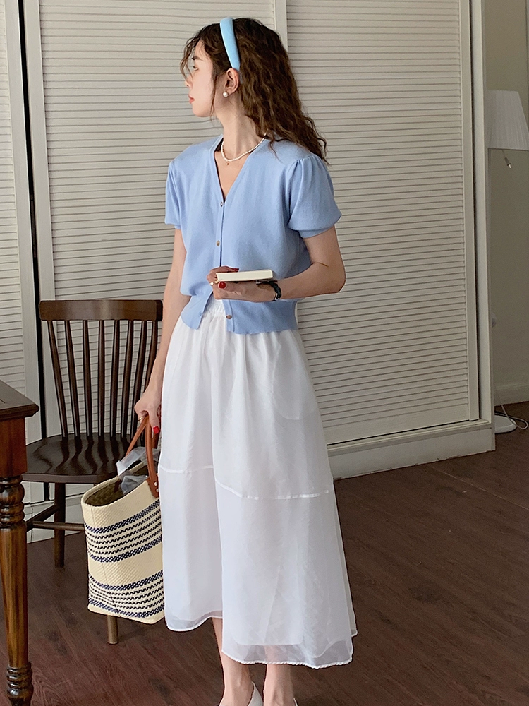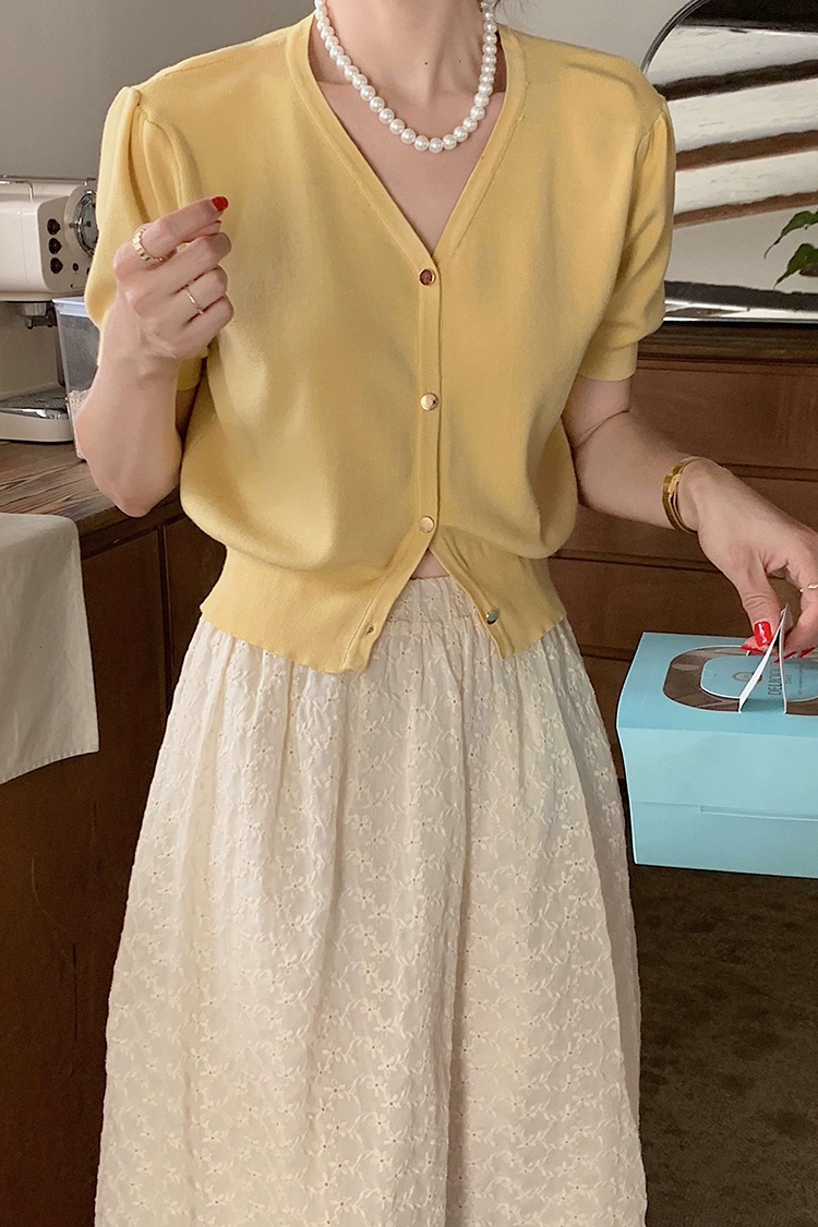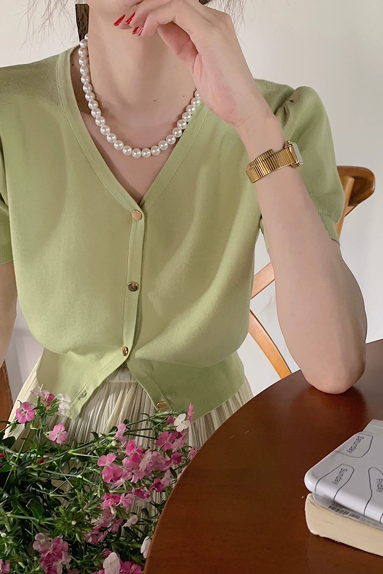 Seven Sheep Summer Ice Silk Short Sleeve V-neck Black Knitted Cardigan Women's Thin Short Puff Sleeve Top