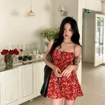 Sexy backless summer a-line skirt with red floral suspenders