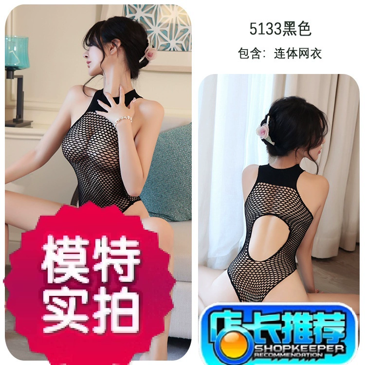 Sexy hollow net clothing, large size fishnet jumpsuit, thin transparent tights, European and American black silk seductive mood pajamas