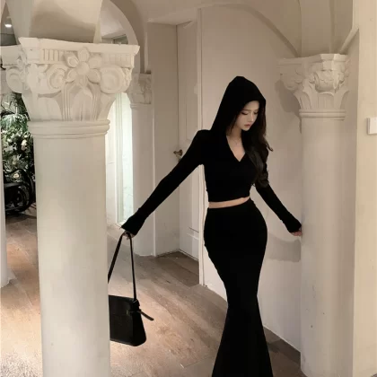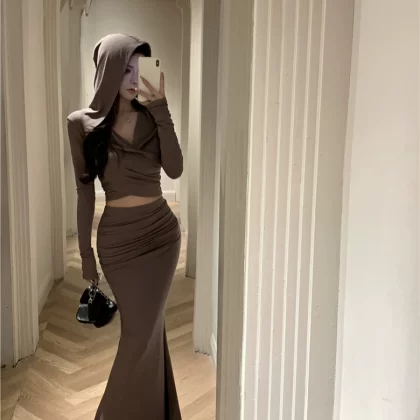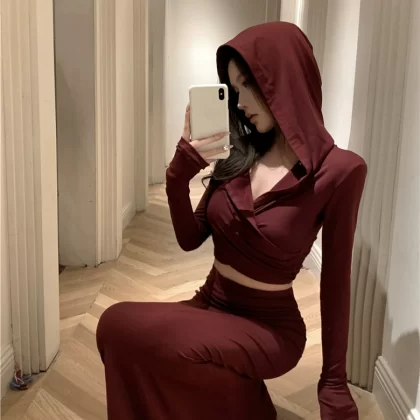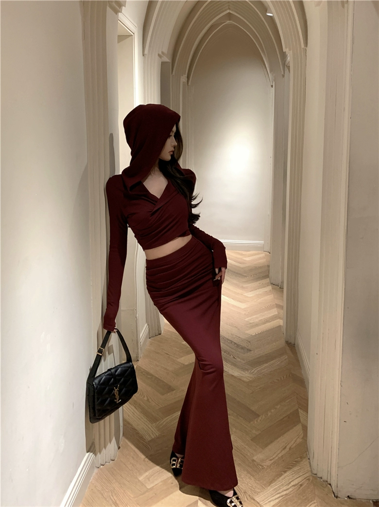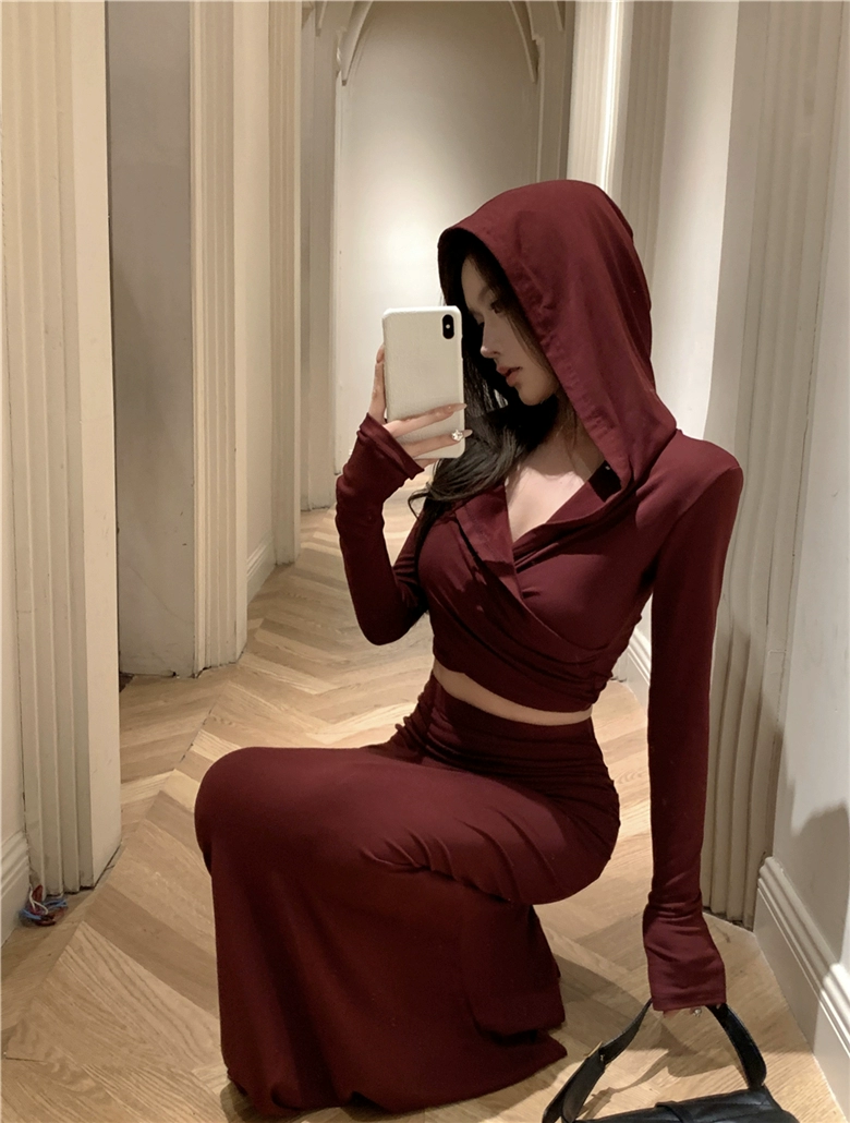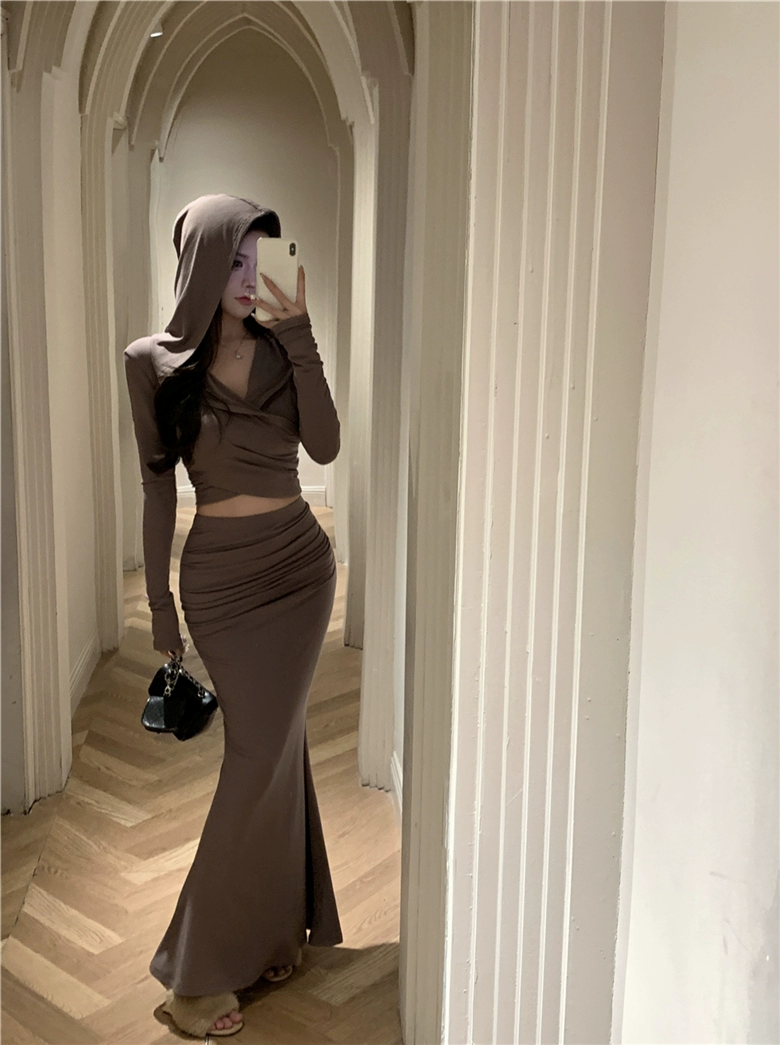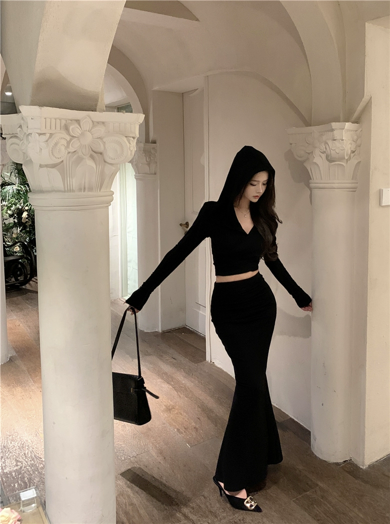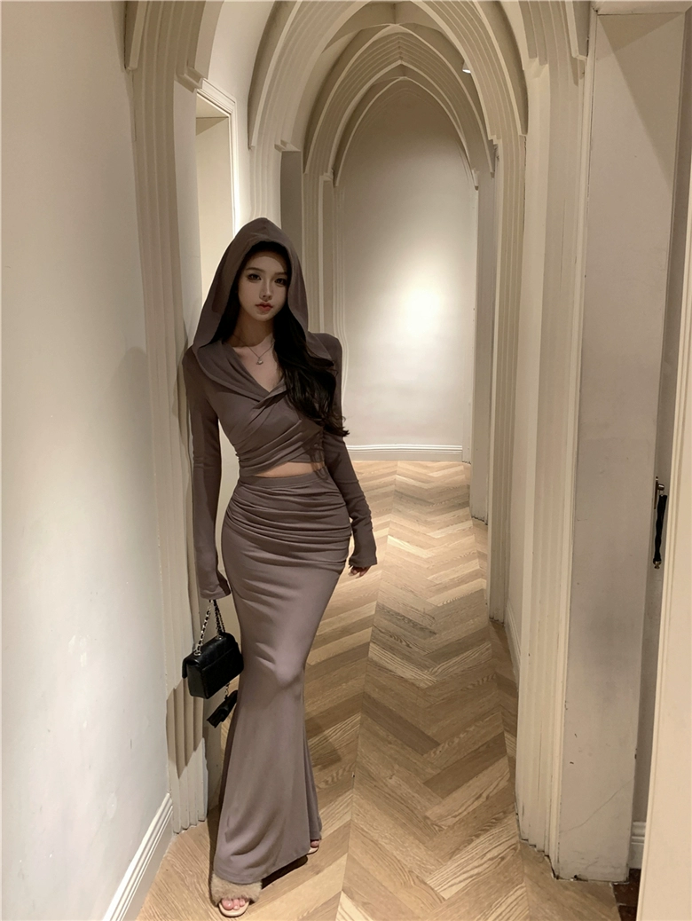 | nameOriginal | Sexy hot girl fashion suit for women summer 2024 new style temperament hooded top slimming hip-covering skirt two-piece set |