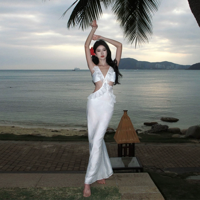 Sexy island vacation wear backless beach skirt with suspenders