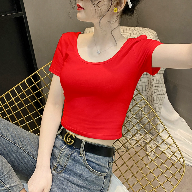Sexy low-neck beautiful back slim T-shirt for women with versatile short sleeves