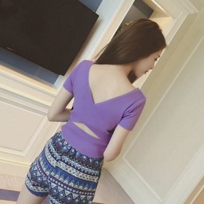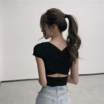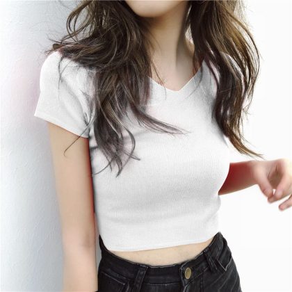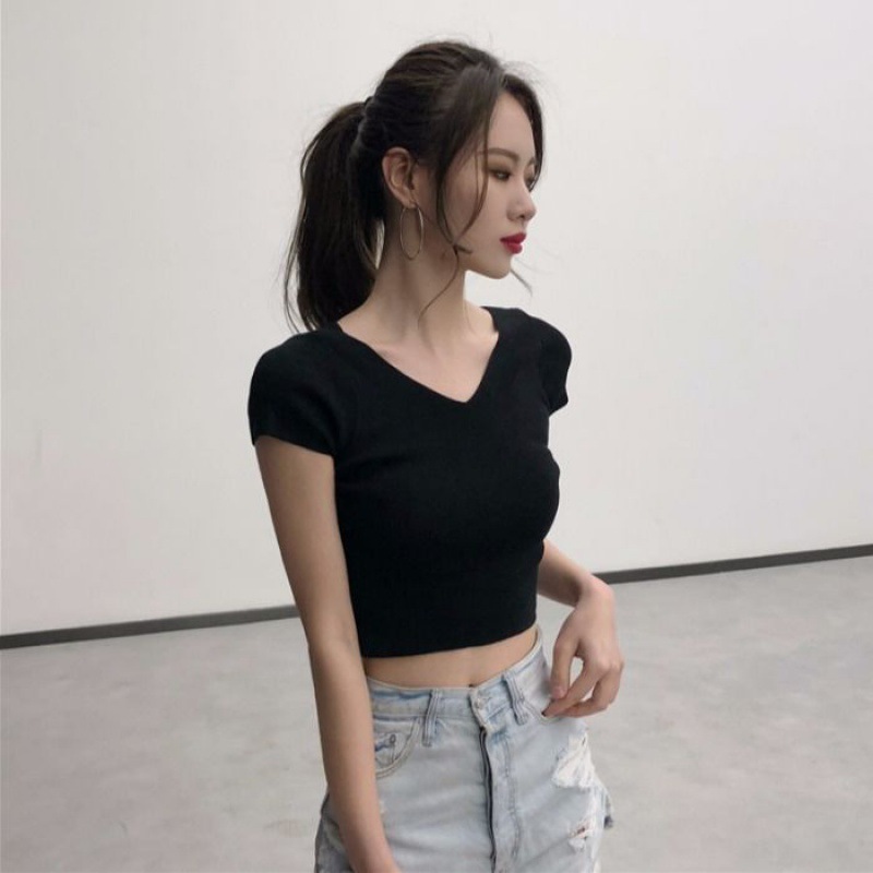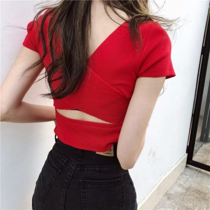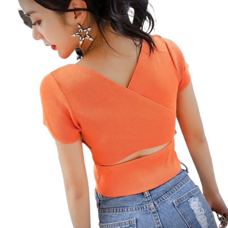 | nameOriginal | Sexy Navel Tight Top Women's Summer New Hong Kong Style Retro V-neck Hollow Short-sleeved Knitted Base Shirt T-shirt for Women |