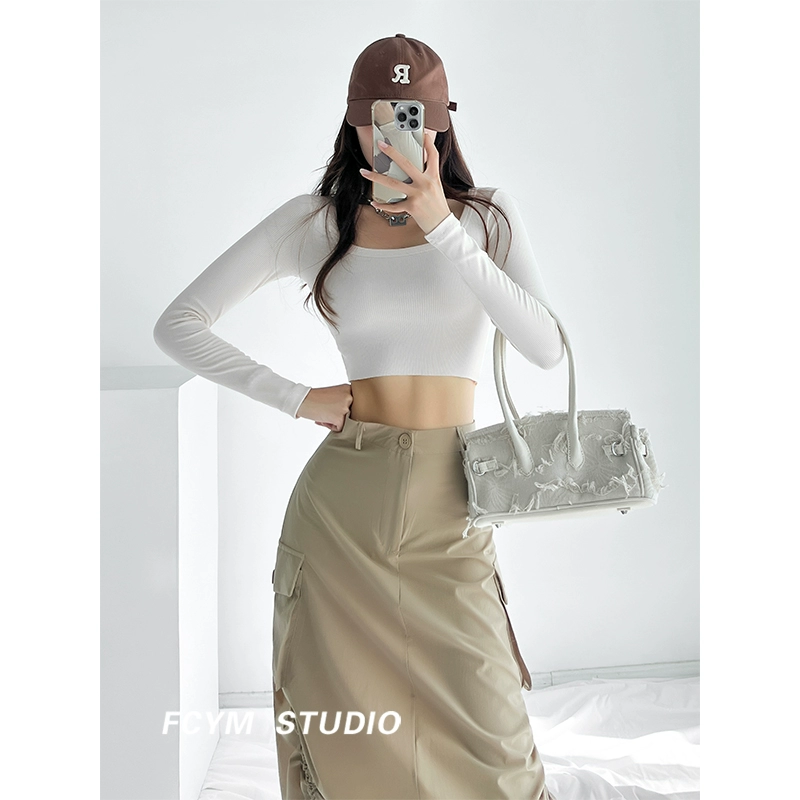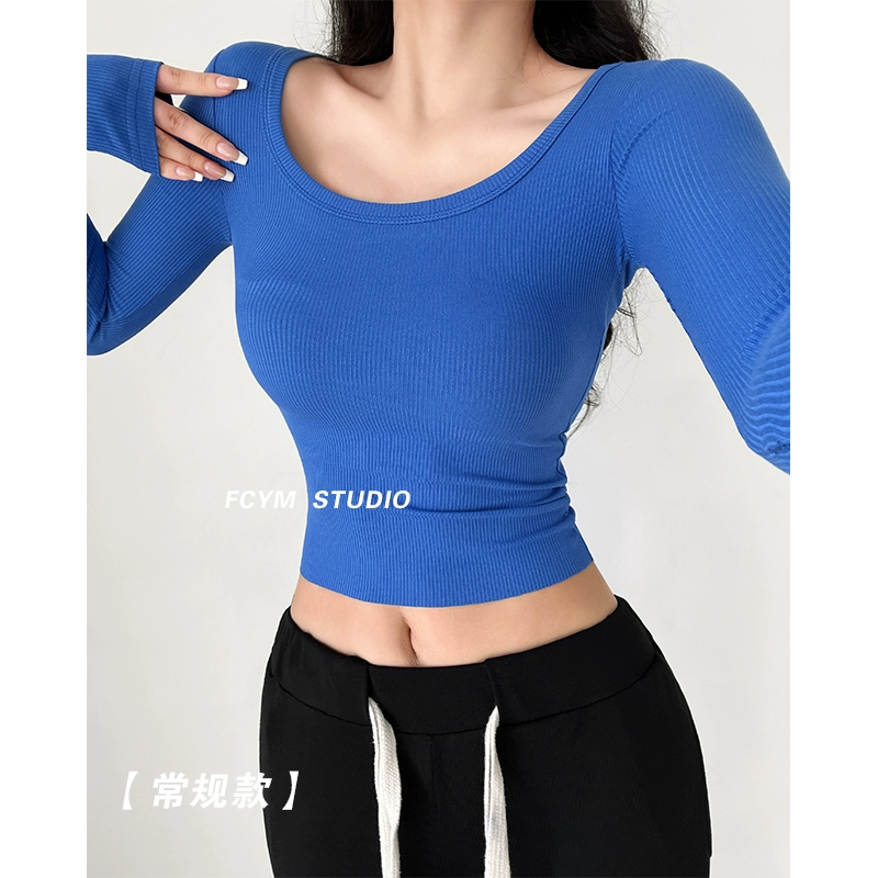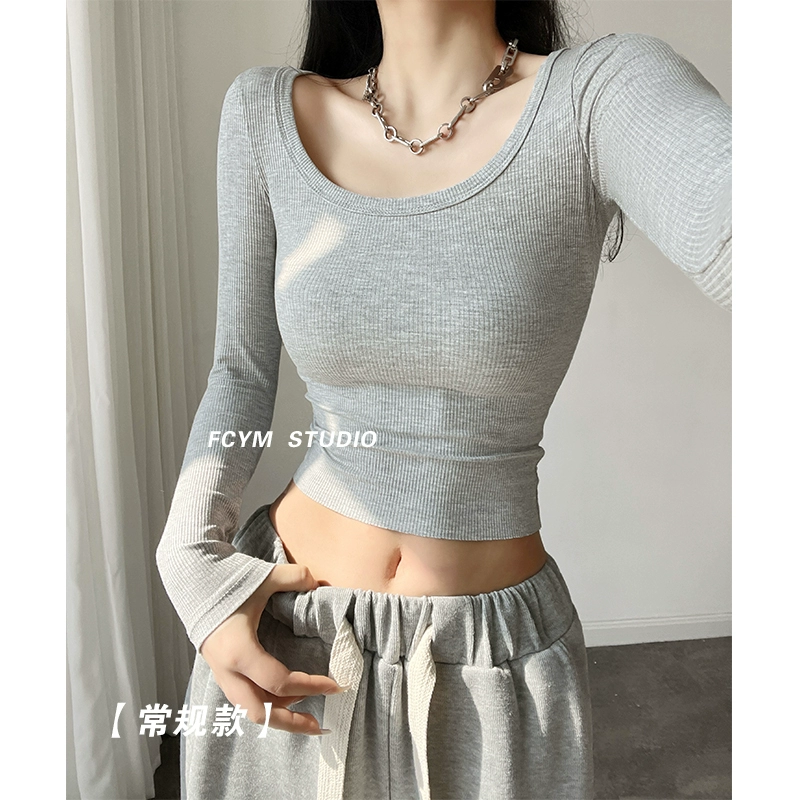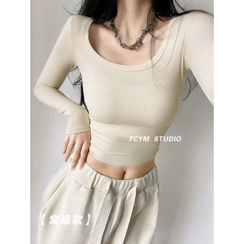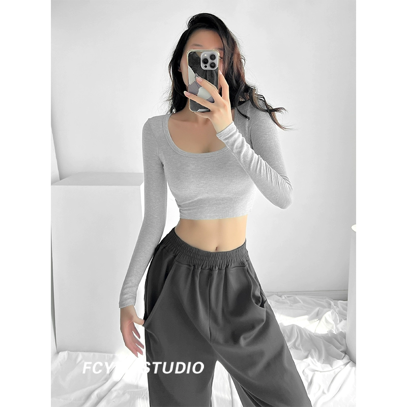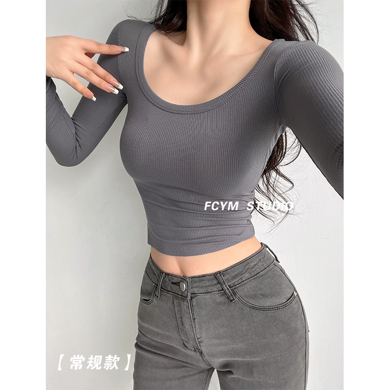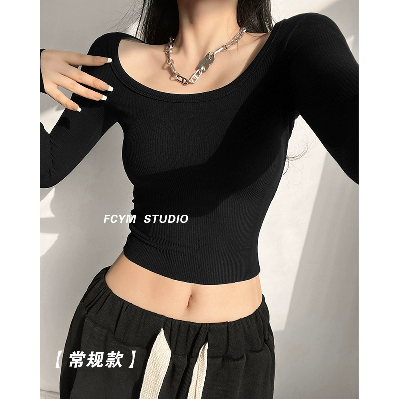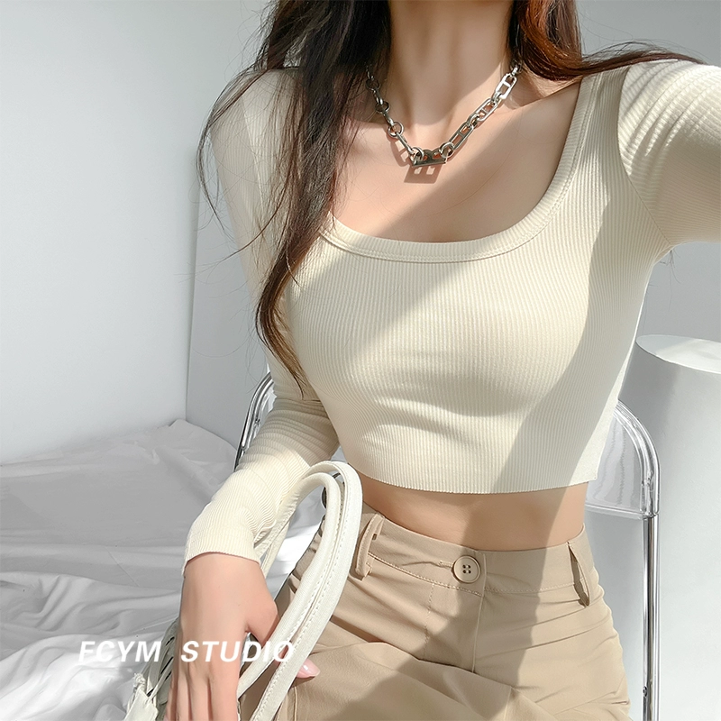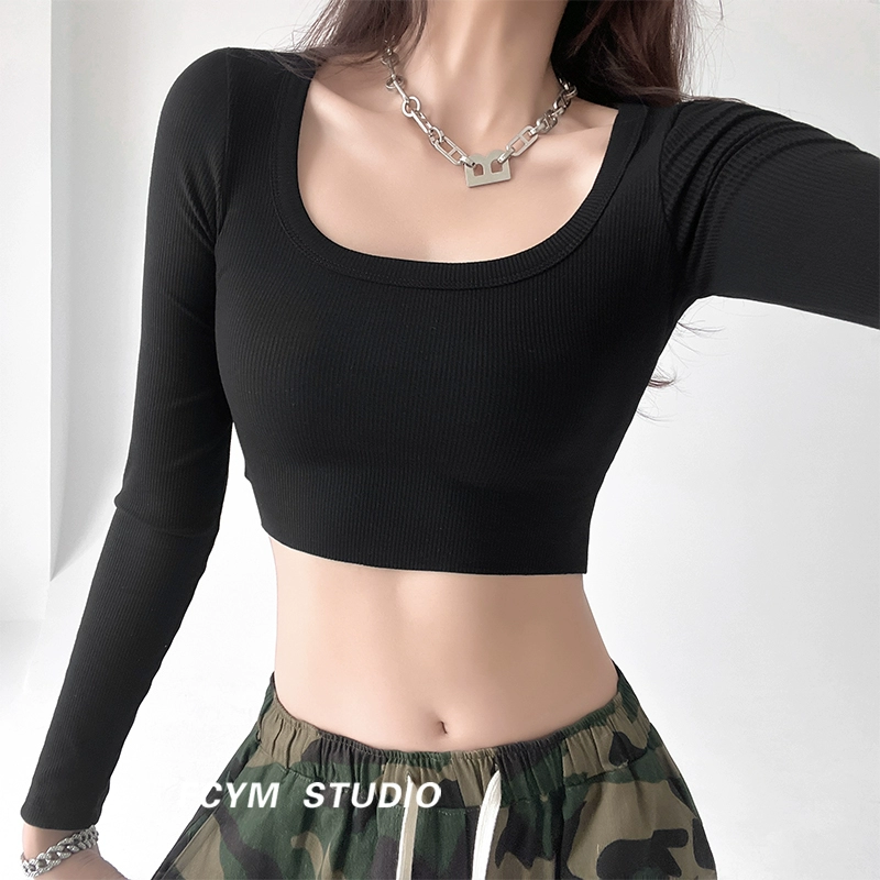 | nameOriginal | Sexy solid color large U-neck navel-baring elastic long-sleeved top |
