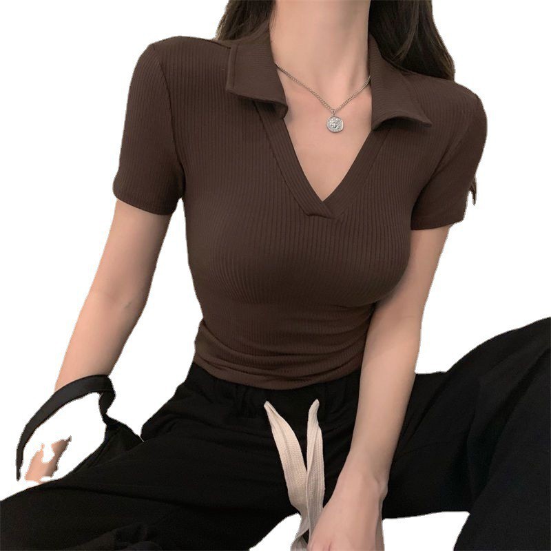 | nameOriginal | Sexy Spice Girl Slim-fit V-neck Short-sleeved Women's Summer Solid Color Polo Shirt Slim-fit Threaded Knitted Base Lass T-shirt Top |