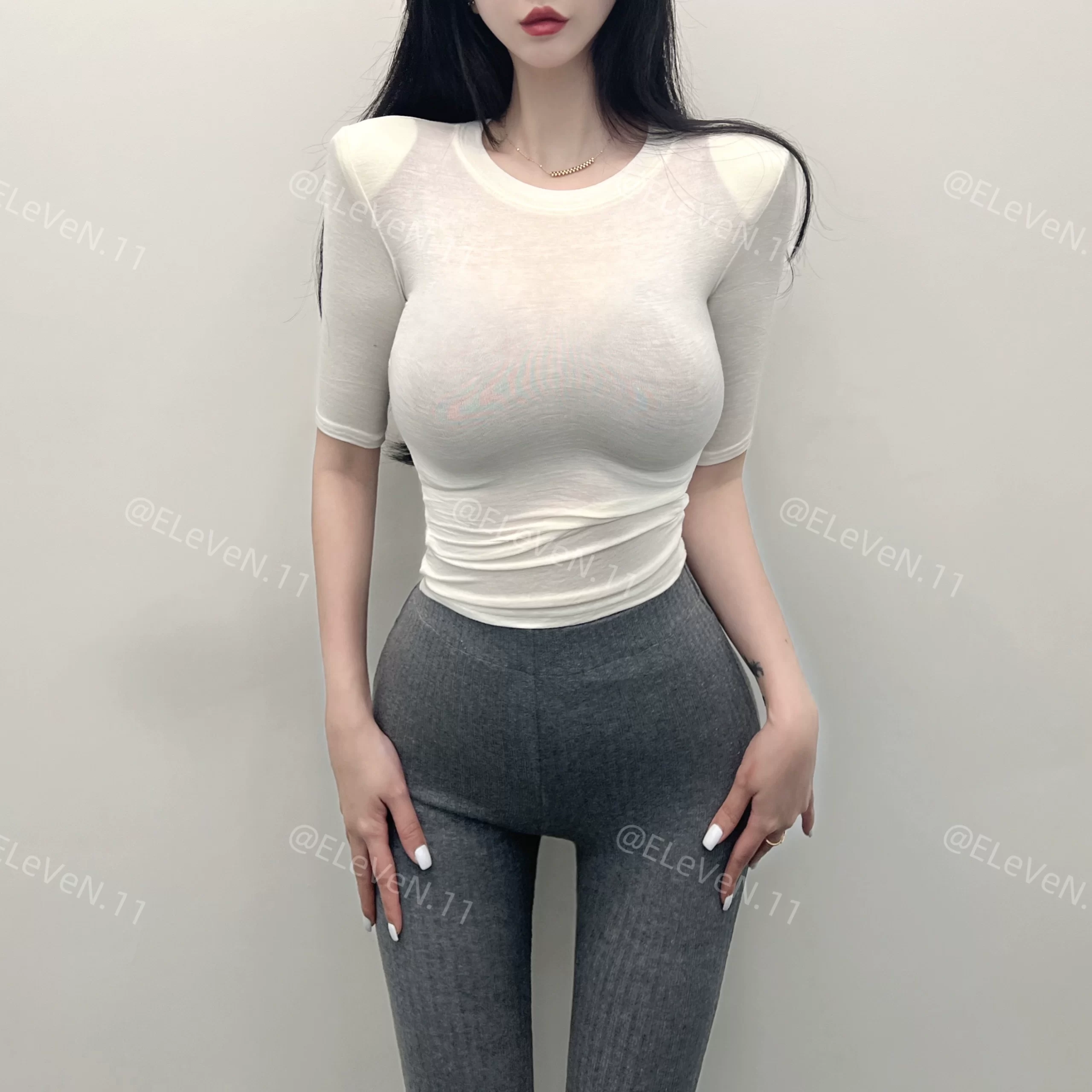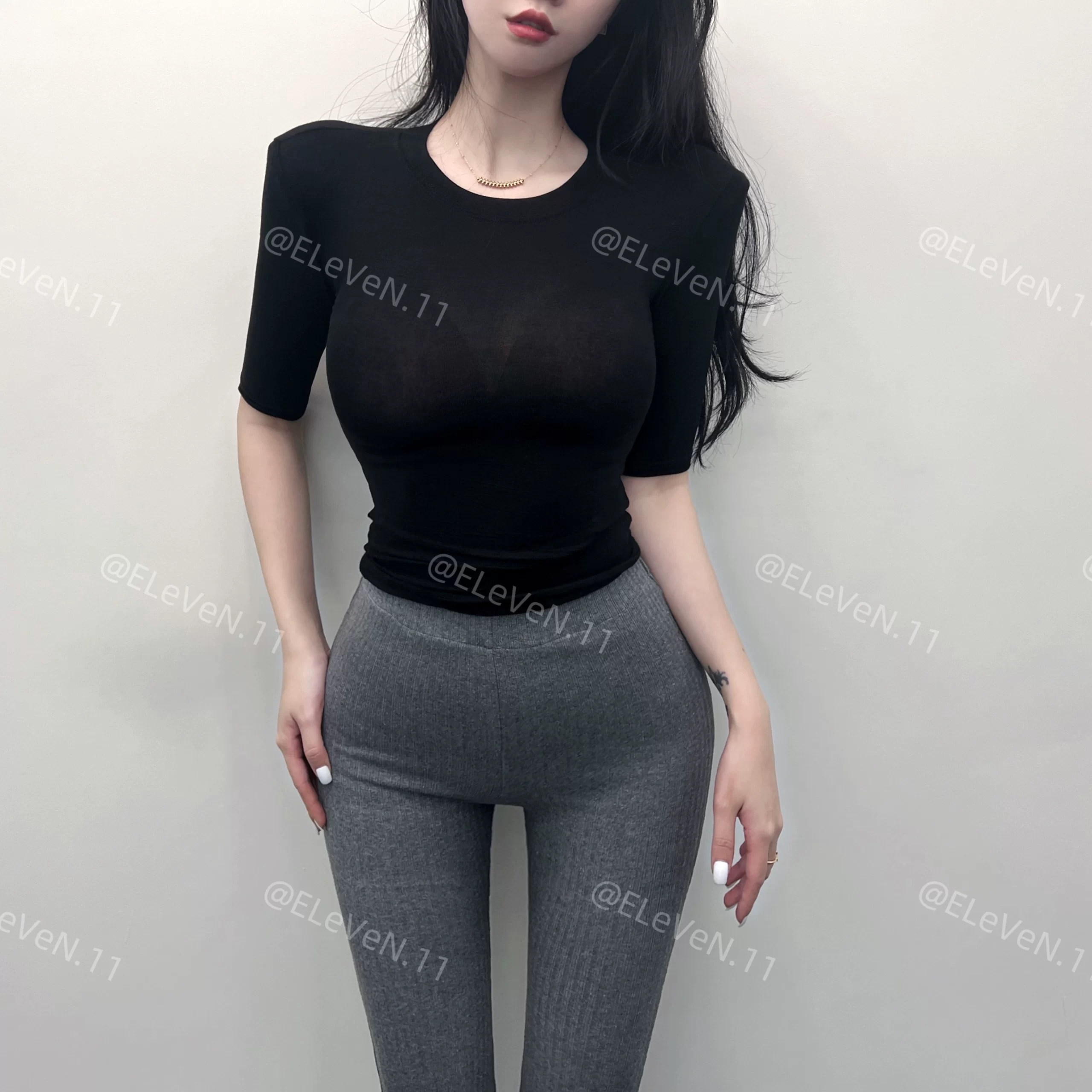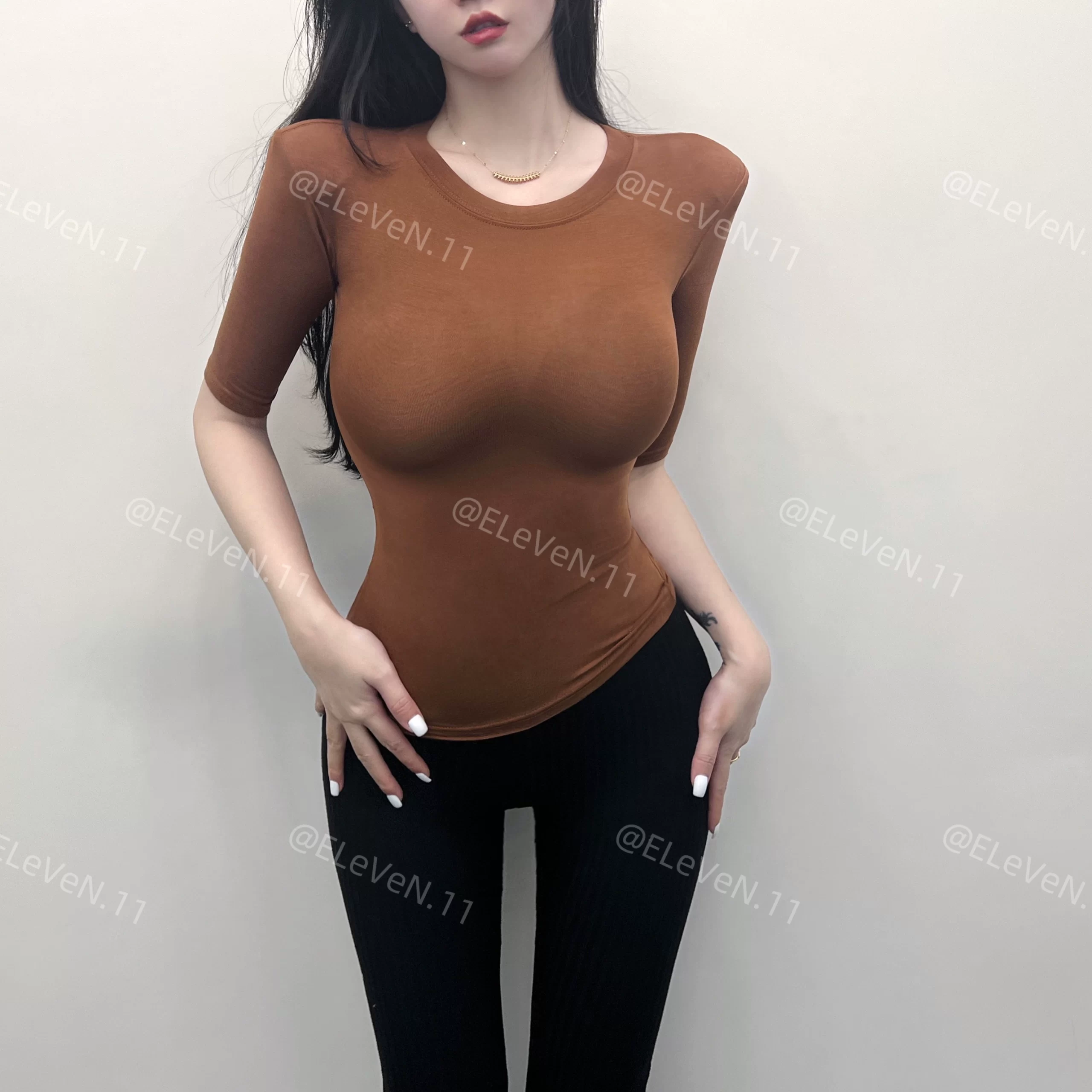 Sexy tight-fitting thin slightly see-through three-quarter sleeve top
