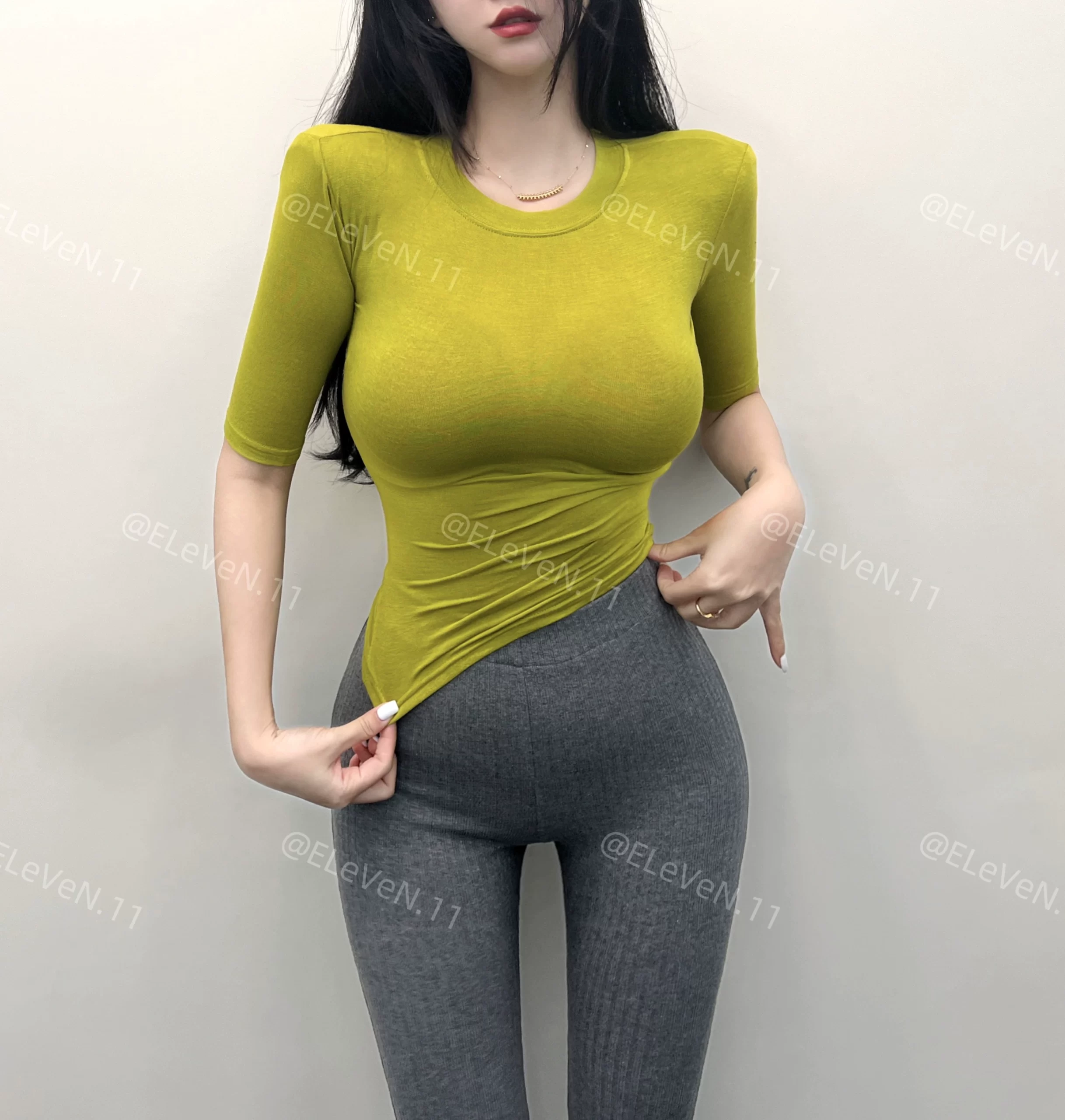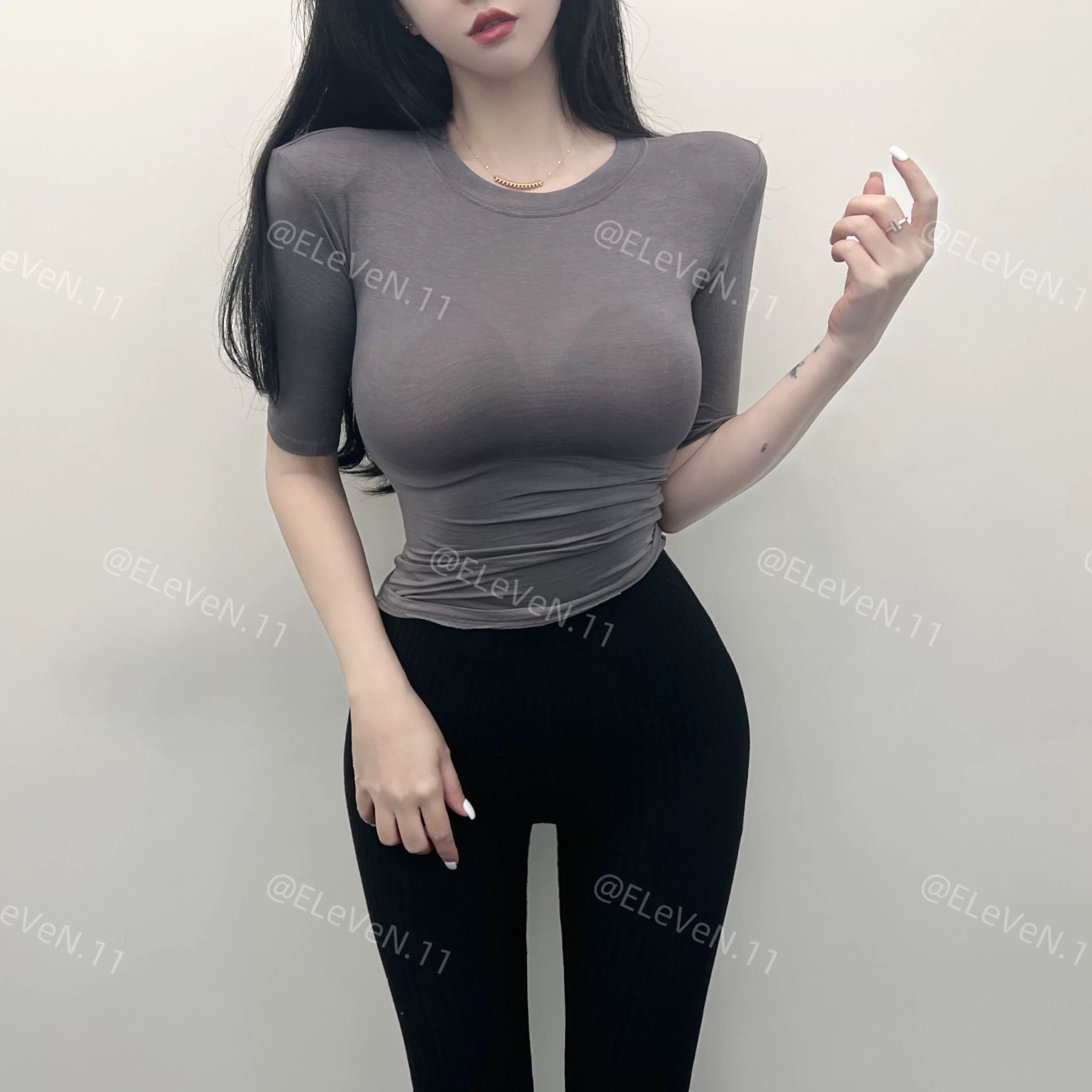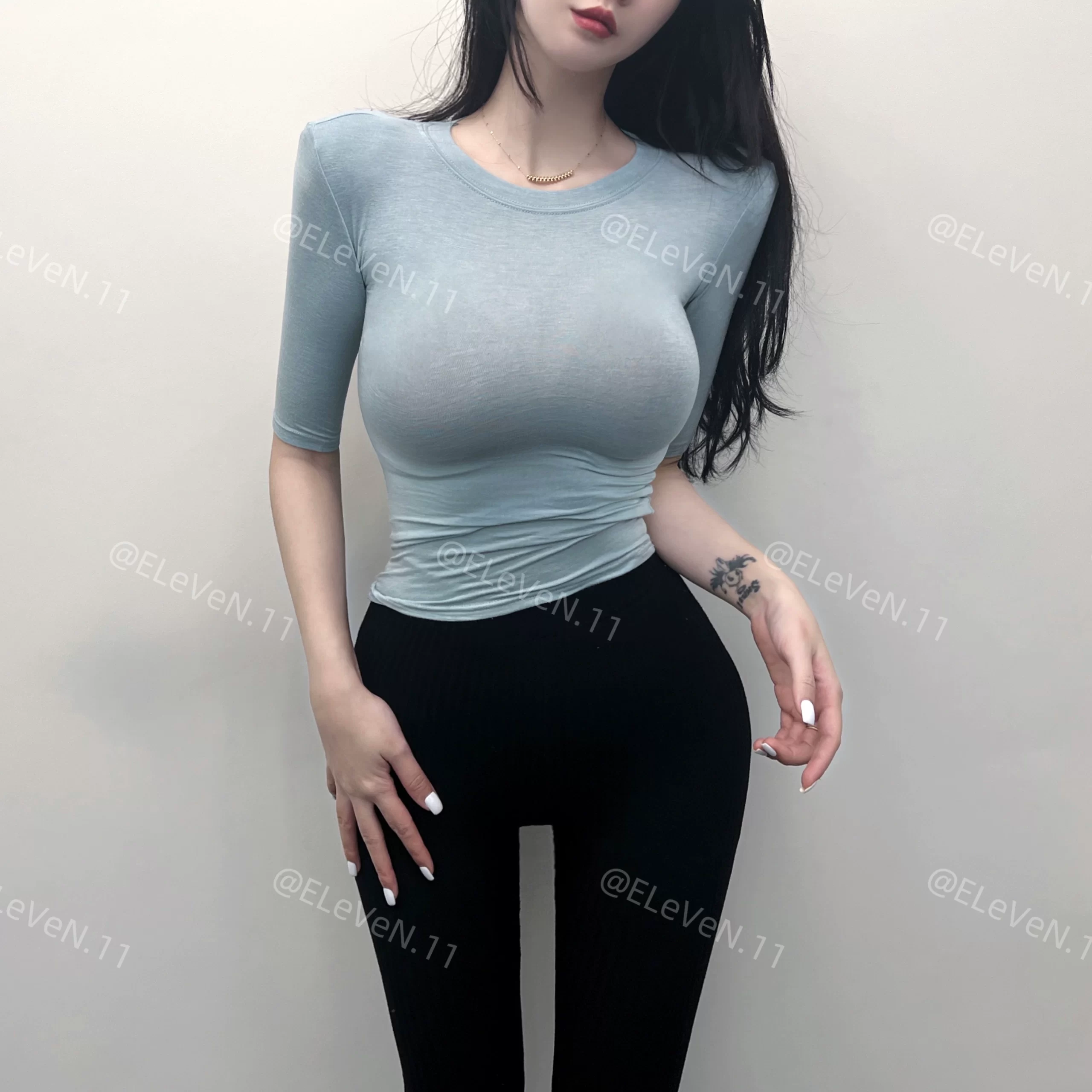 Sexy tight-fitting thin slightly see-through three-quarter sleeve top
